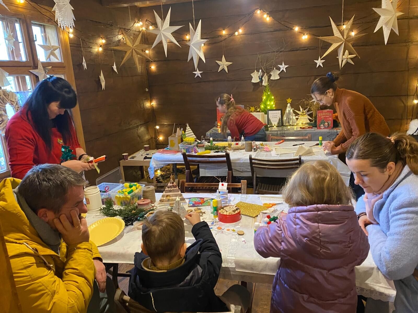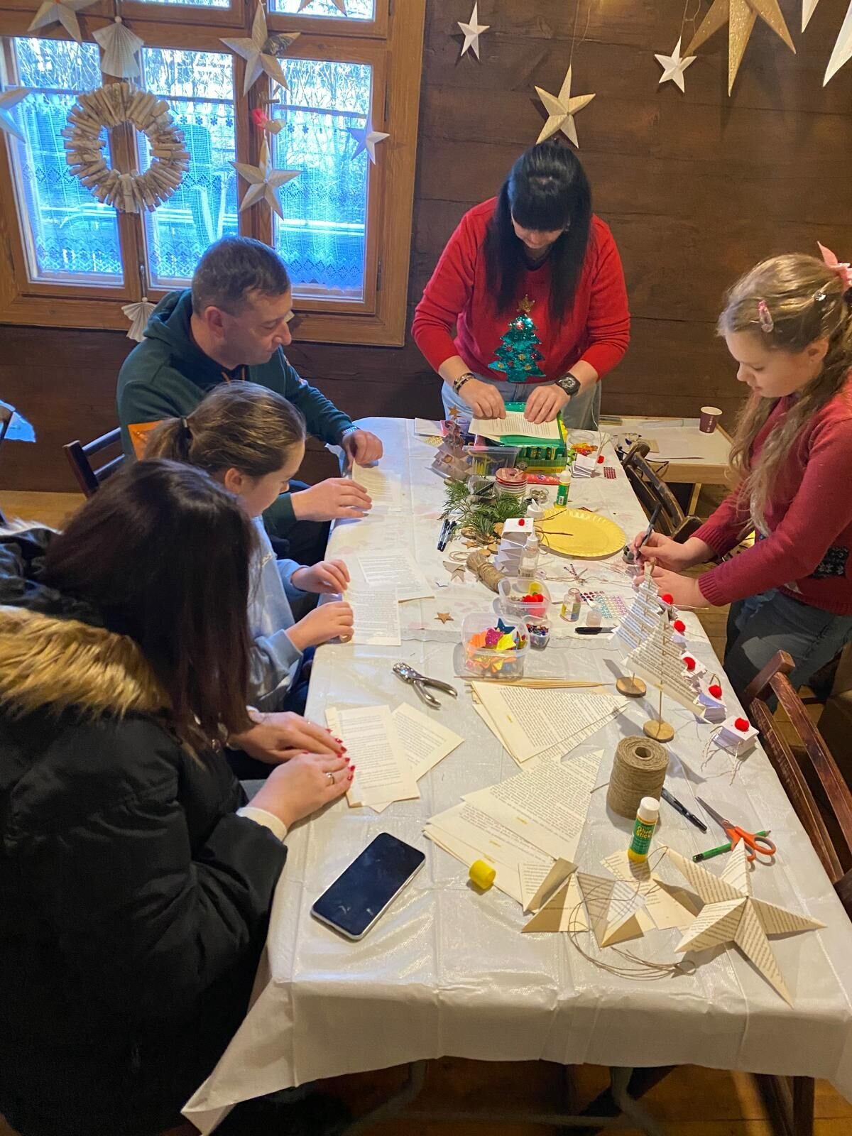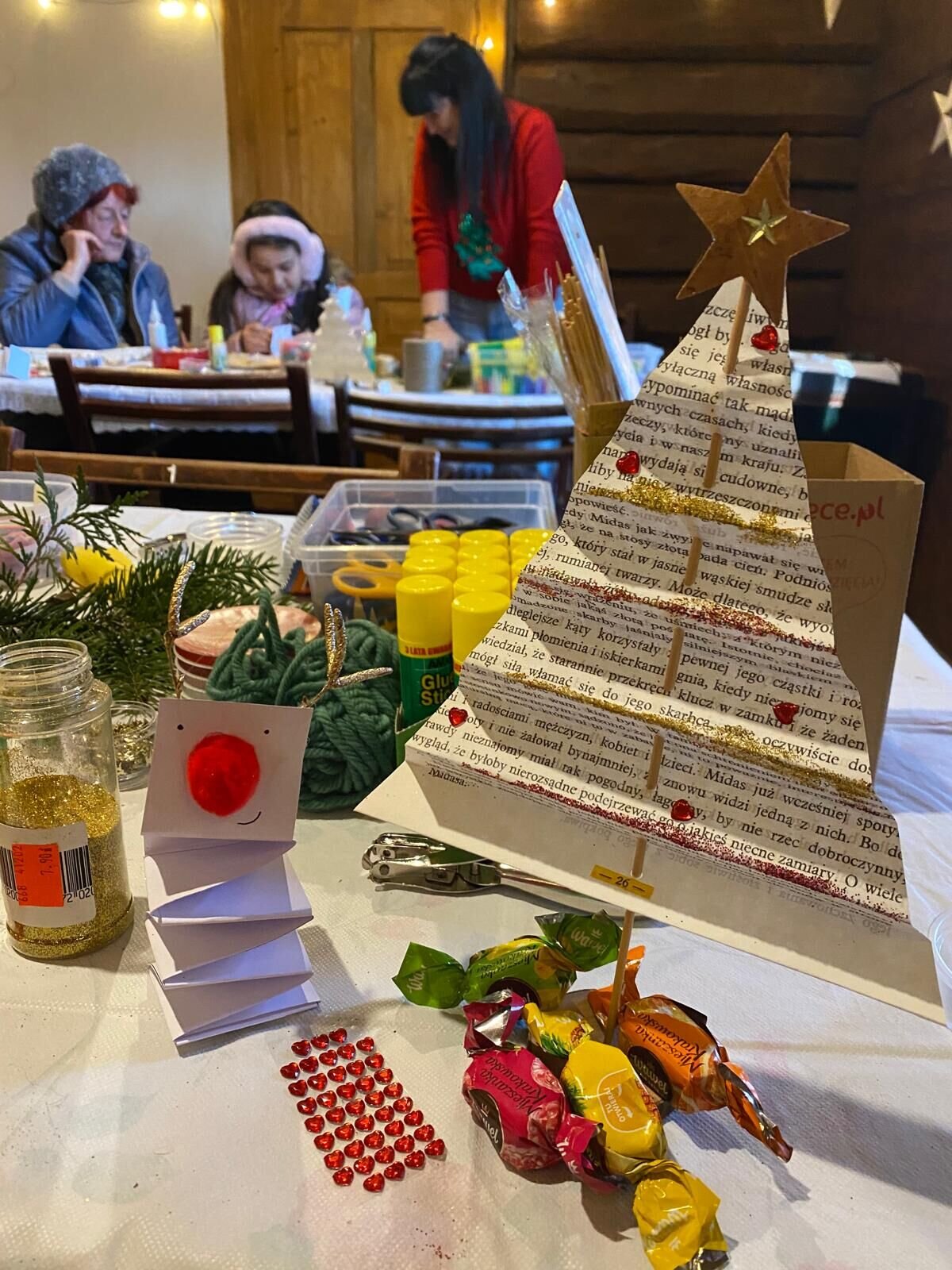 Podczas warsztatów stare, zniszczone kartki i niepotrzebne papiery zyskały drugie życie. W ciepłym, pełnym zapachu świąt klimacie uczestnicy odkrywali, jak z pozornie zwyczajnych stron można stworzyć niezwykłe ozdoby choinkowe — anioły, gwiazdy, bombki, rozety oraz lekkie jak piórko zawieszki. Pojawiły się również papierowe renifery, ptaszki i choinki, które dodały warsztatom jeszcze więcej świątecznego uroku i radosnej atmosfery, a wspólna praca sprzyjała rozmowom, uśmiechom, wymianie pomysłów, a także wspomnieniom o dawnych papierowych ozdobach choinkowych.