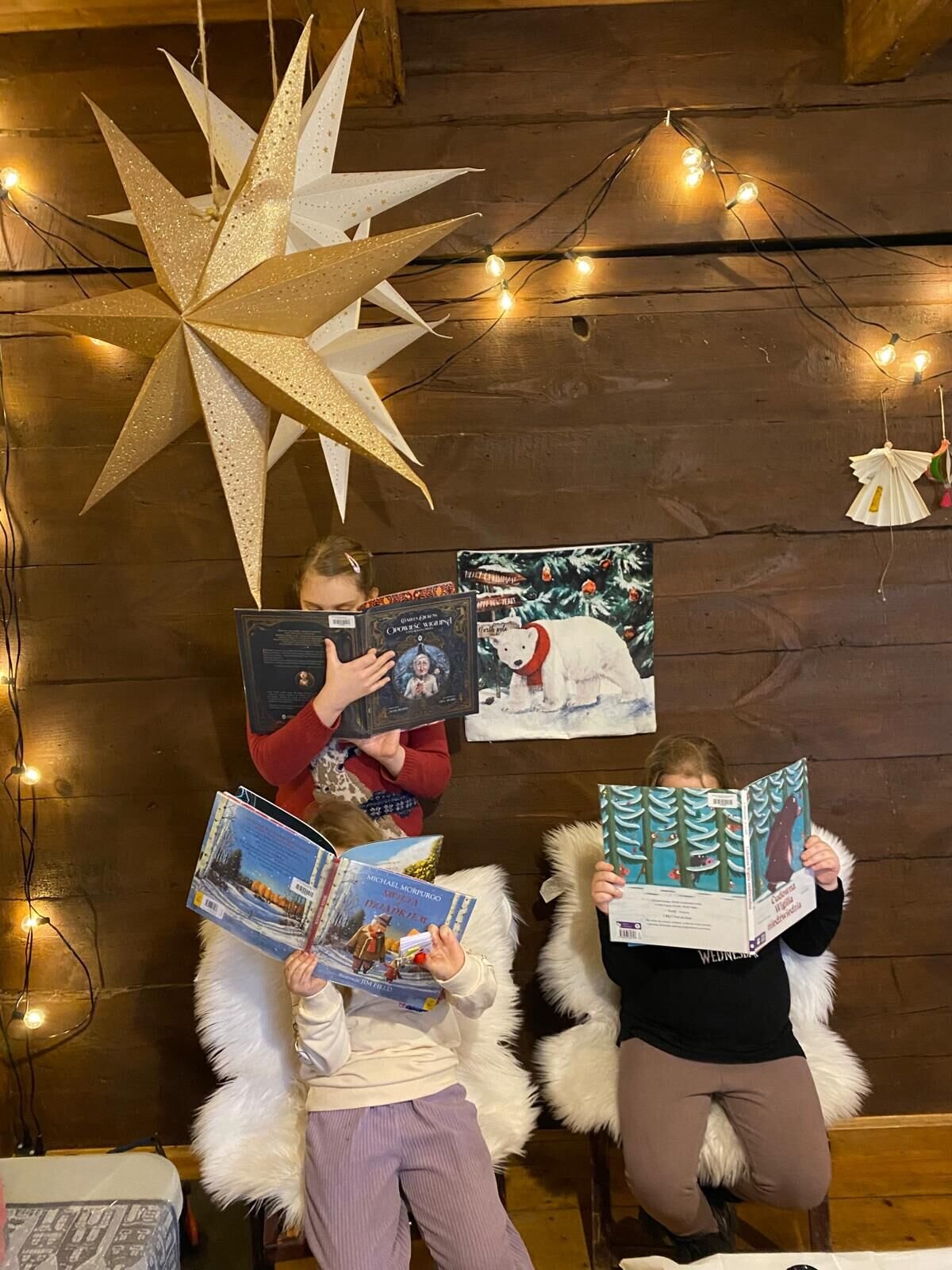 Po zakończeniu części plastycznej na uczestników czekały adwentowe zadania-niespodzianki, które zachęcały do dalszej kreatywności, refleksji i radosnego oczekiwania na Święta. Był to także moment na wyciszenie i odpoczynek — specjalnie przygotowane, przytulne miejsce pełne świątecznych historii zapraszało do relaksu z książką. Uczestnicy mogli oddać się lekturze oraz poznać kilka z licznych, pięknych publikacji zakupionych przez bibliotekę, które mają umilić czytelnikom zimowy, świąteczny czas.