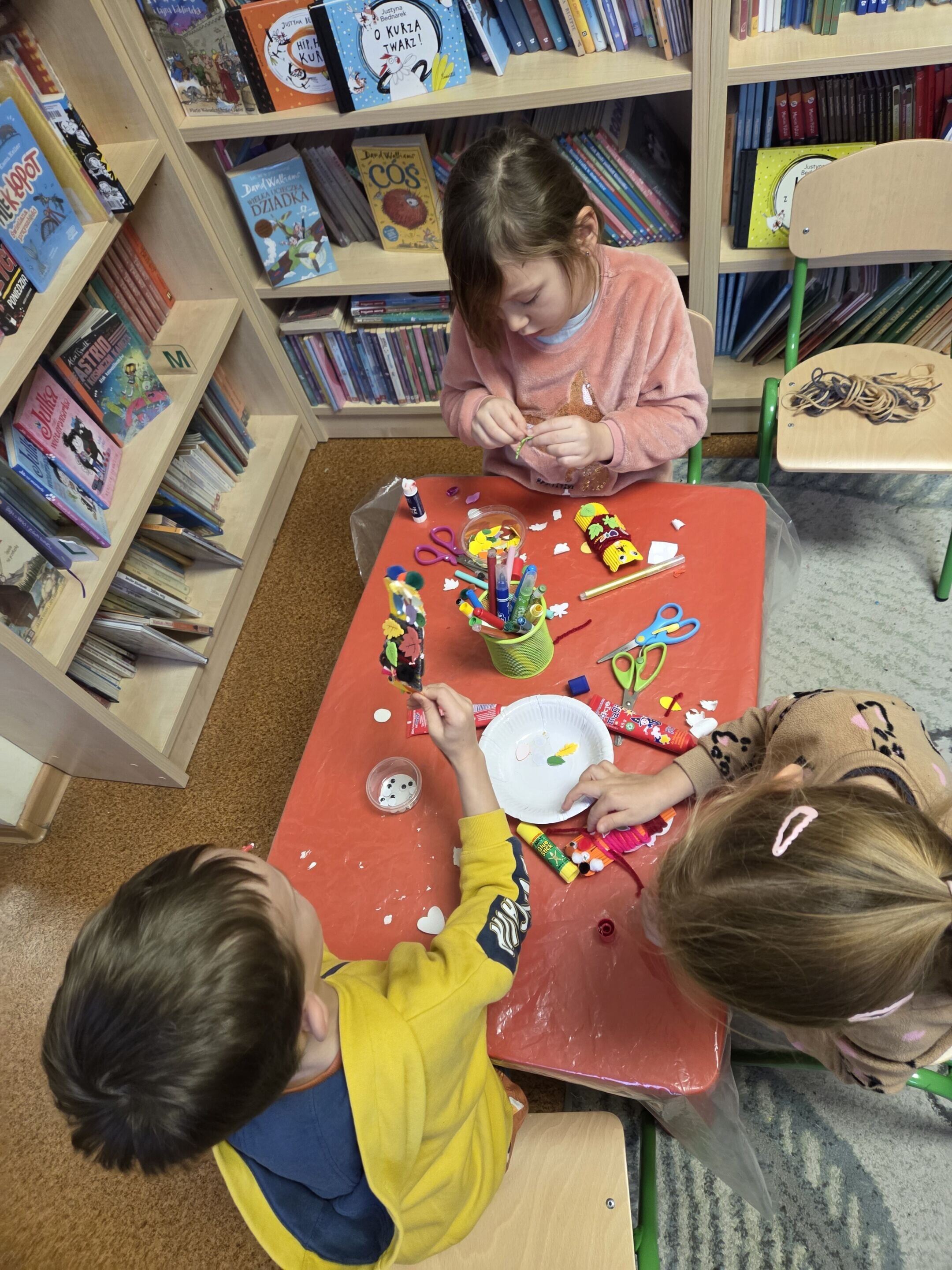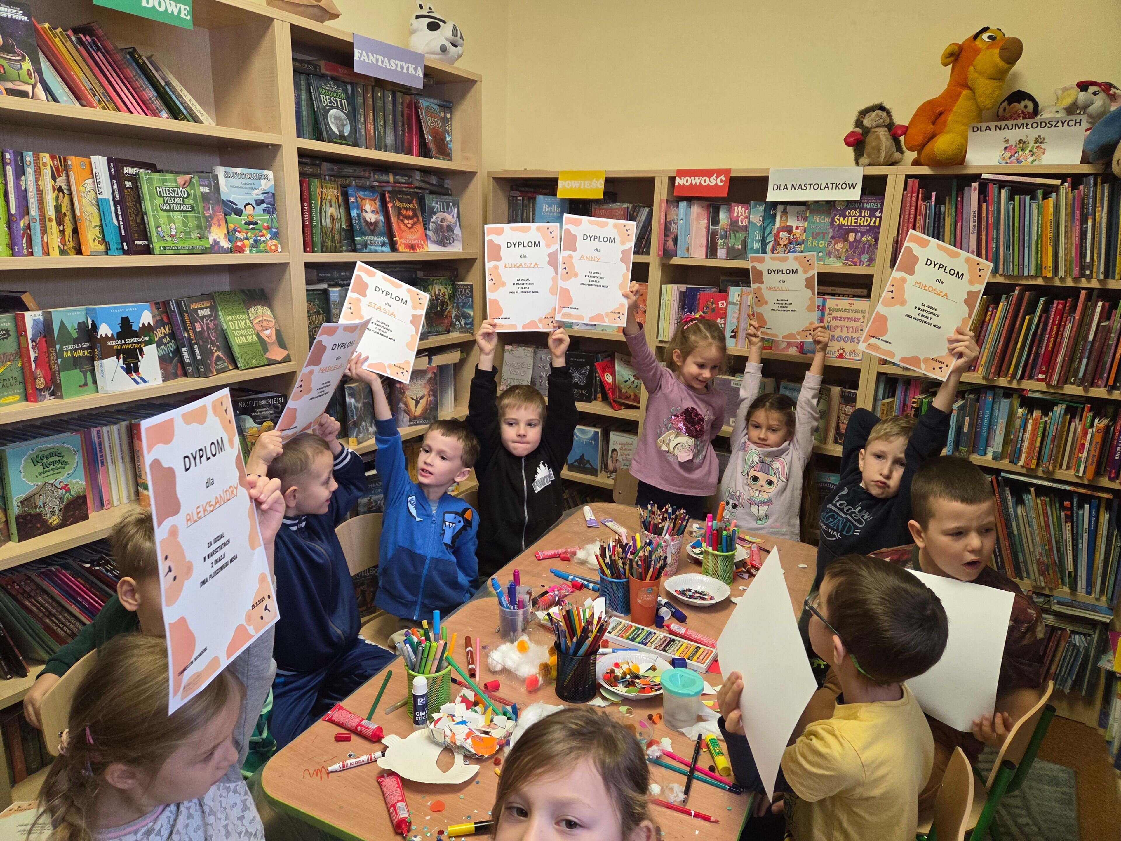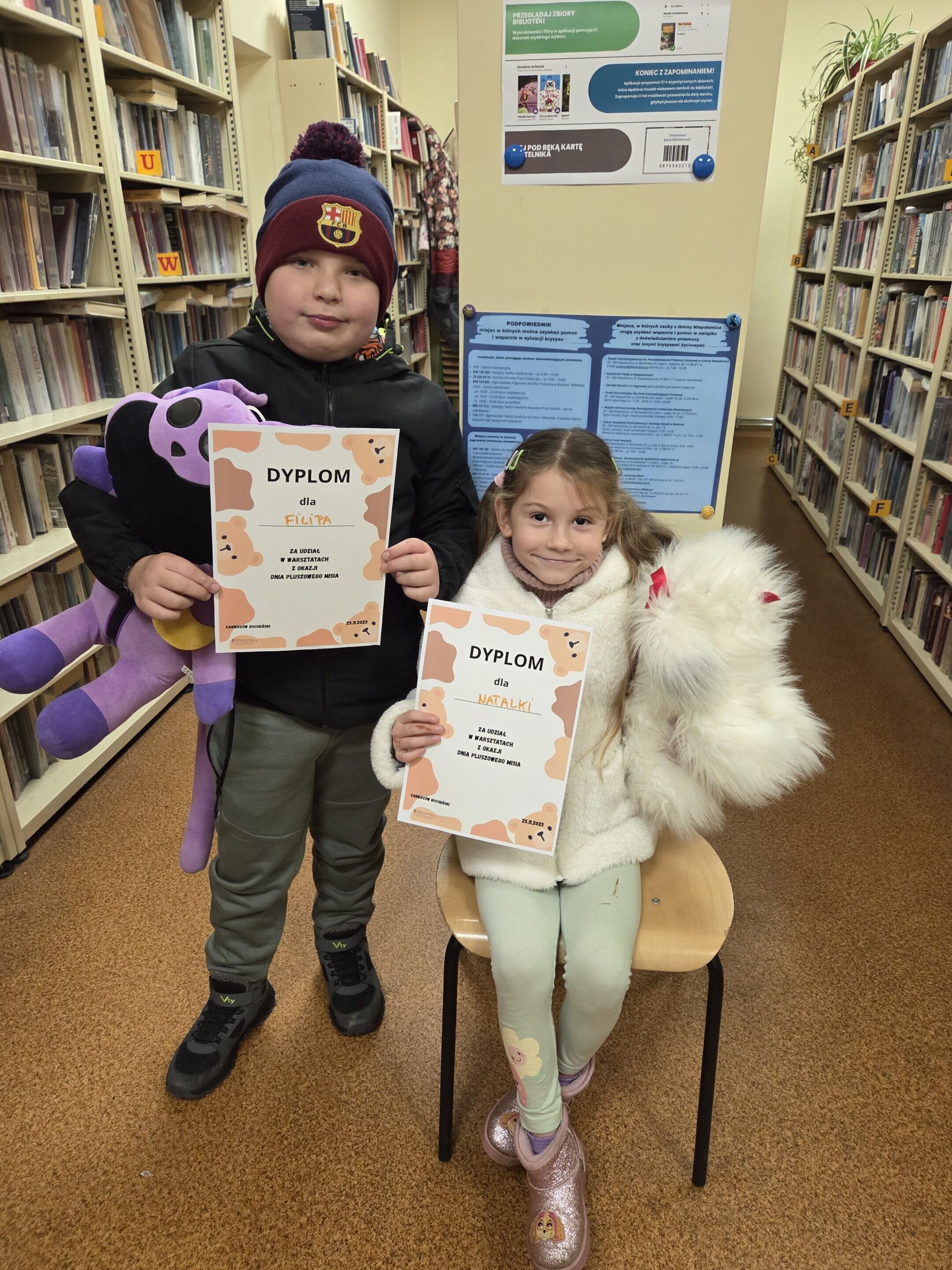 Biblioteka zaprosiła także najmłodszych czytelników wraz z rodzicami oraz swoimi ukochanymi przytulankami do wspólnego świętowania Dnia Pluszowego Misia. W ramach misiowych warsztatów w dniu 25 listopada dzieci mogły stworzyć i ubrać misia po swojemu dzięki Fabryce "Miś i spółka" - magicznemu miejscu, które przeniosło maluchy w bajkowy świat zabawek. Następnie dzieci konstruowały z kartonowych pudełek, kolorowych materiałów i bibuły domki dla swoich pluszowych przyjaciół oraz malowały wyjątkowe niedźwiadki z użyciem farb i widelców. Na koniec zajęć można było wykonać misiowy ślad na śniegu czyli odbić „łapki Puchatka” wykorzystując do tego celu stempelki z ziemniaka. Nie mogło także zabraknąć misiowych dyplomów, którymi zostali obdarowani uczestnicy zabawy. Dziękujemy najmłodszym za przyłączenie się do tego święta i zapraszamy do wspólnego świętowania za rok.