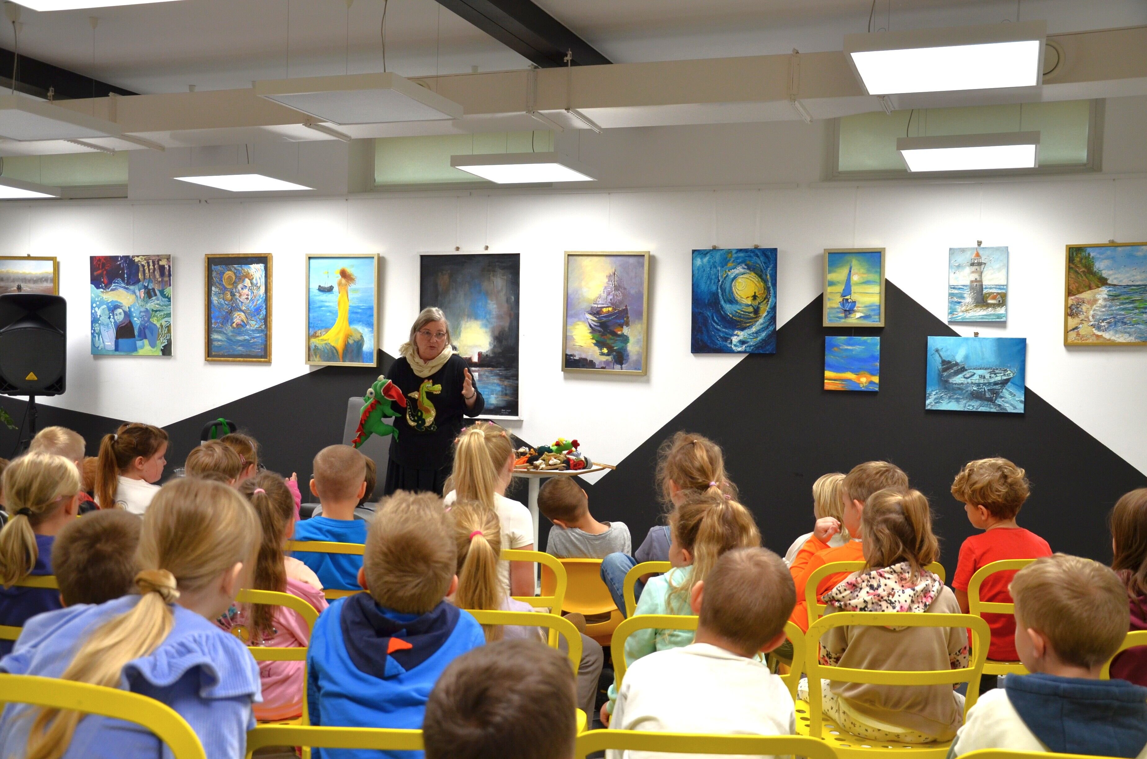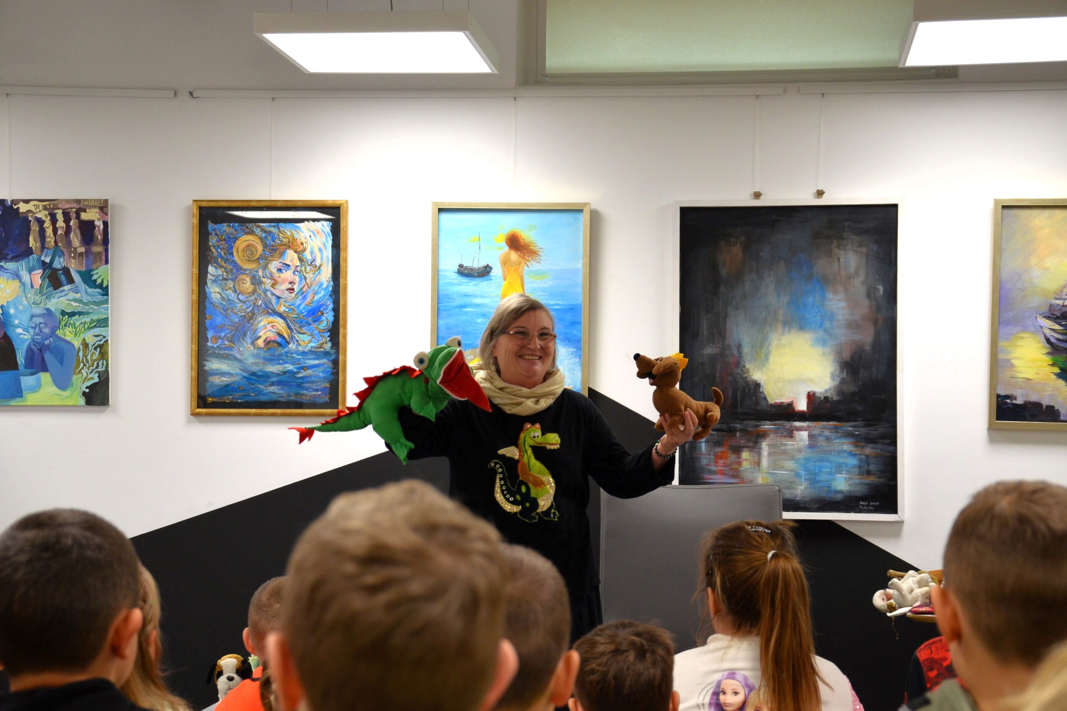 Na szczególną uwagę w dorobku pisarskim Pani Ewy zasługują opracowania znanych legend, to one były motywem przewodnim tych dwóch prawie płótoragodzinnych  wizyt w naszych książnicach. Uczniowie mogli poczuć klimat wydarzeń opisywanych przez autorkę i jeszcze lepiej poznać bohaterów  wspaniałych historii, dzięki oryginalnym rekwizytom, jakie przywiozła ze sobą pisarka. Była kusza, Smok Wawelski, Pan Twardowski, księżyc i kogut, Królowa Jadwiga i Wanda, a nawet jamnik! Dziewczynki zamieniły się w królewny a chłopcy w smoki i stanęli do rywalizacji w konkursie wiedzy o legendach. Nagrodą w tej potyczce była książka dla szkolnej biblioteki autorstwa naszego gościa. Przy okazji było wiele śmiechu, wspaniałej zabawy i oczywiście mnóstwo informacji  oraz ciekawostek związanych z legendami.  Z pewnością wszystkie wiadomości przydadzą się podczas zajęć w szkole a najmłodszych zachęcą do przeczytania kolejnych niesamowitych książek Pani Ewy.