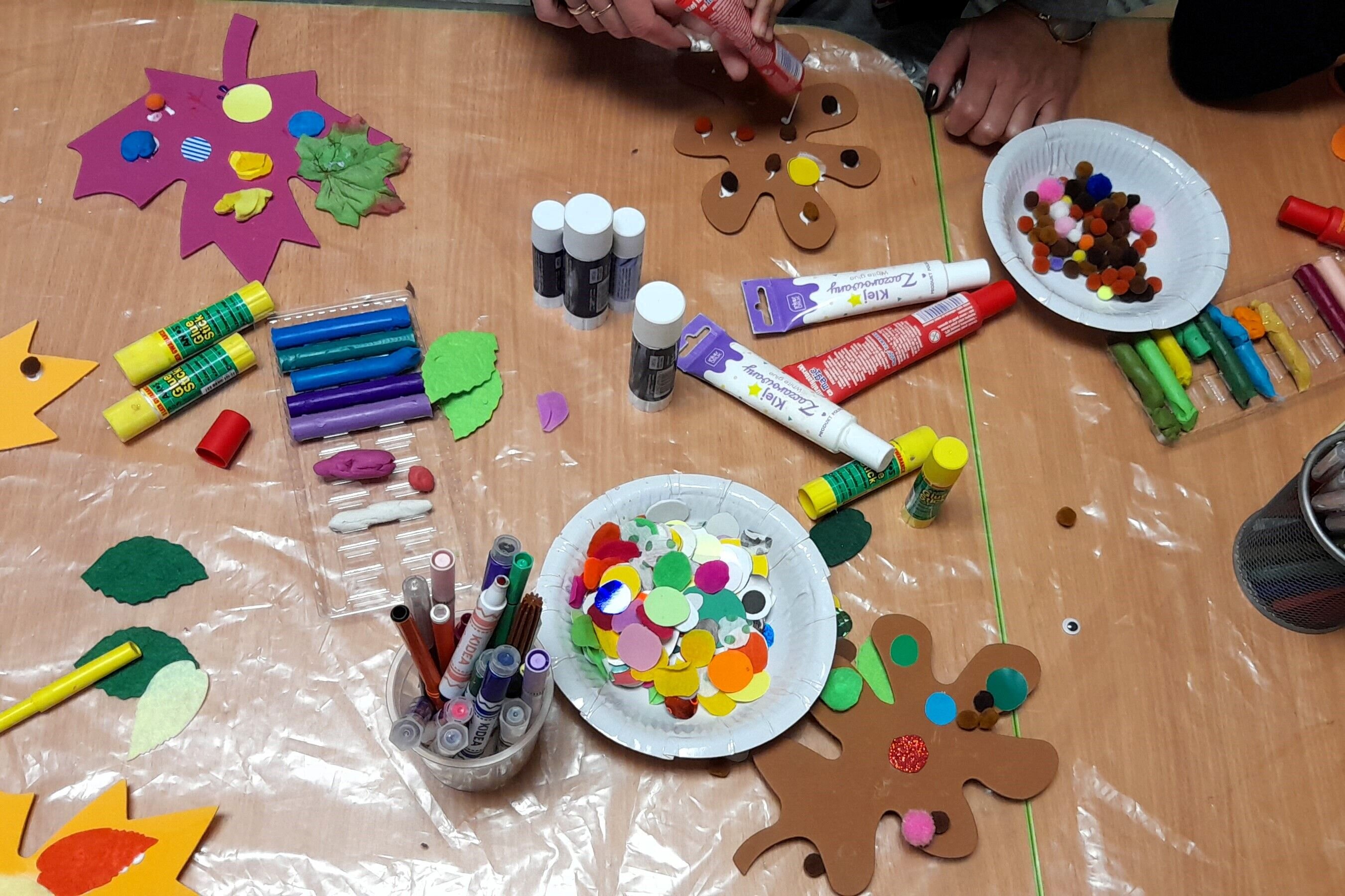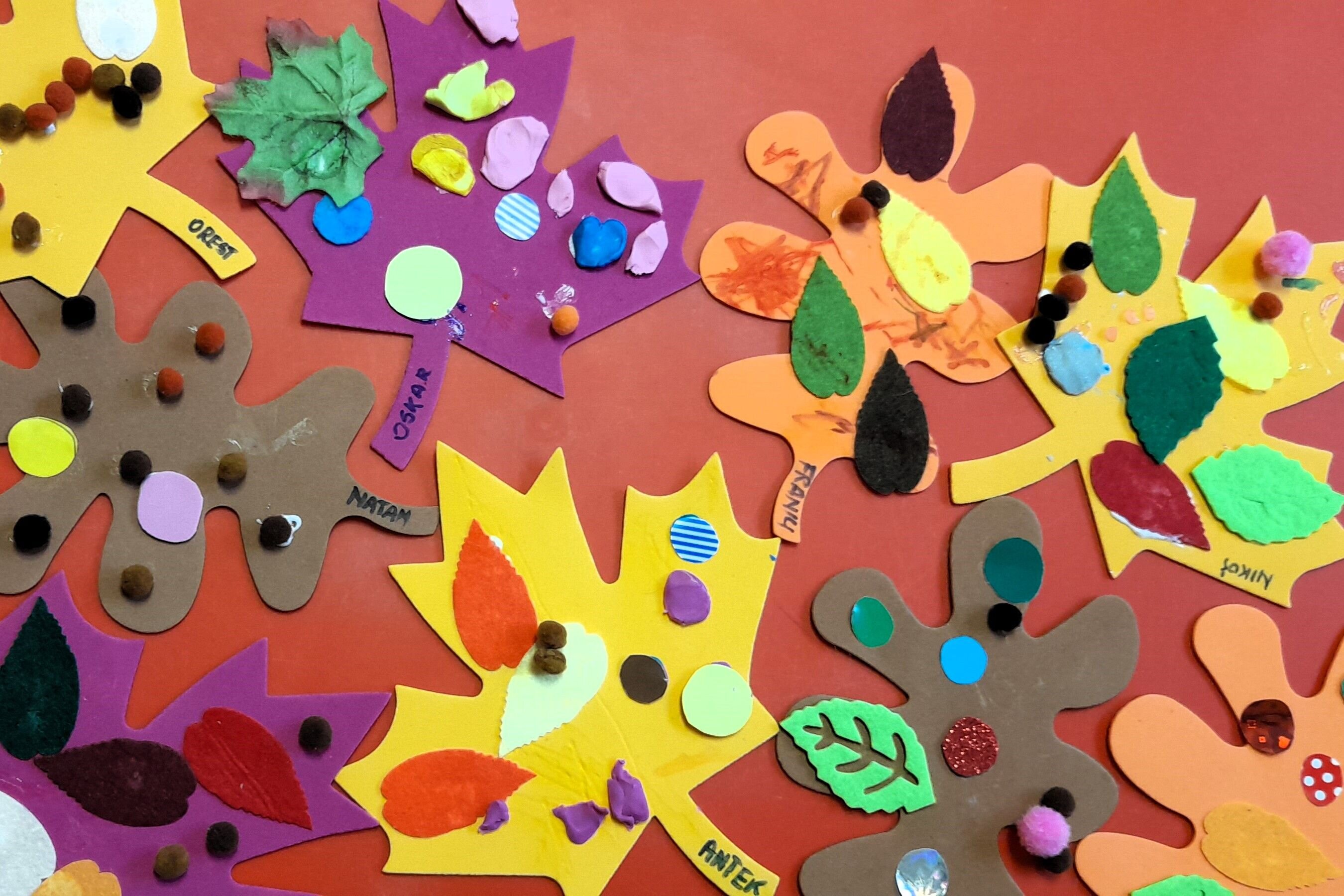 Kiedy przyszedł czas na zajęcia plastyczne przedszkolaki stworzyły duże jesienne drzewo pełne barw przy użyciu odrysów dziecięcych dłoni jako liści, które oczywiście należało pokolorować i ozdobić. Dzięki temu każdy przedszkolak znalazł na stworzonym wspólnie obrazie swój listek, co sprawiło wiele radości i satysfakcji.