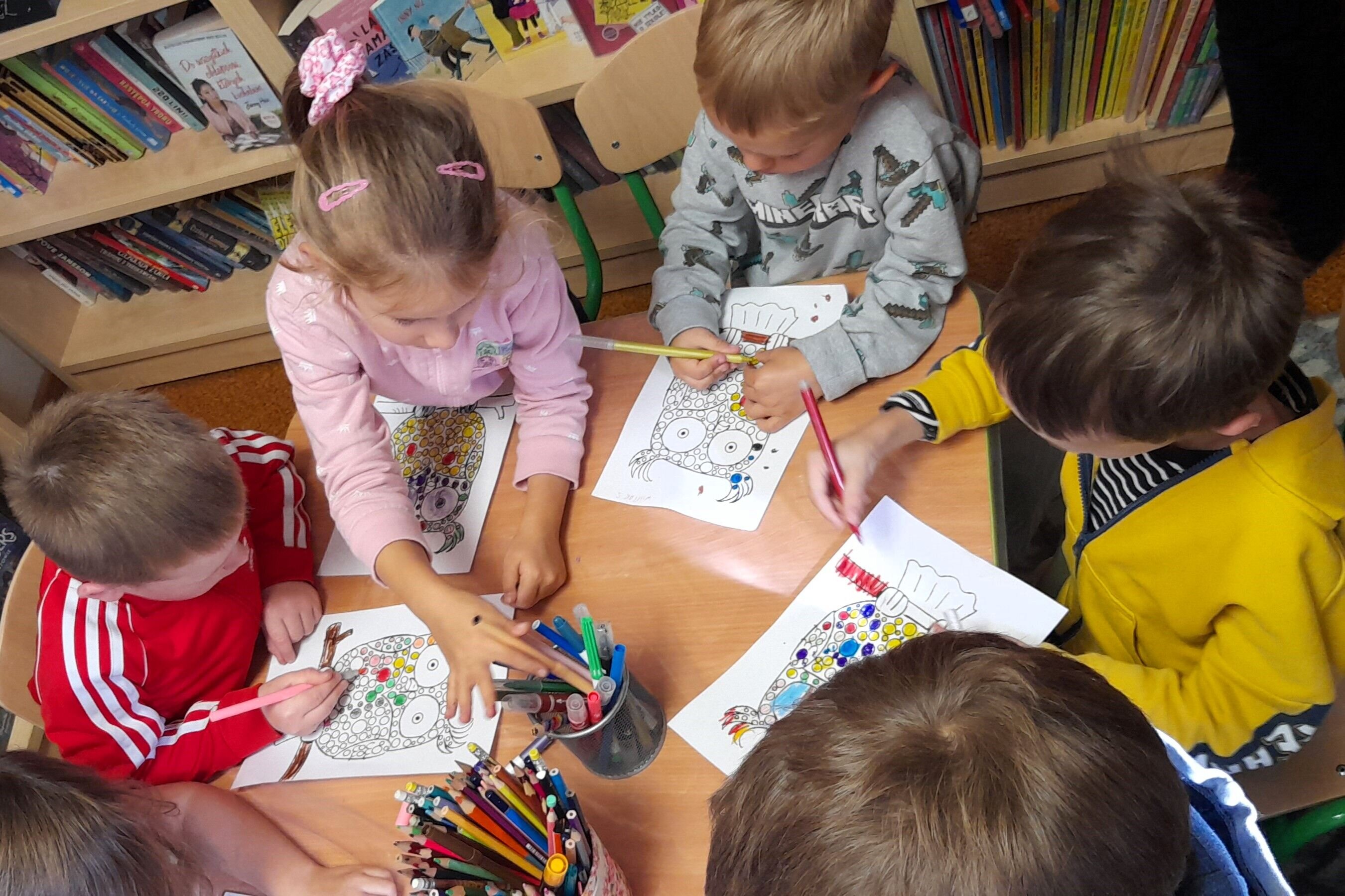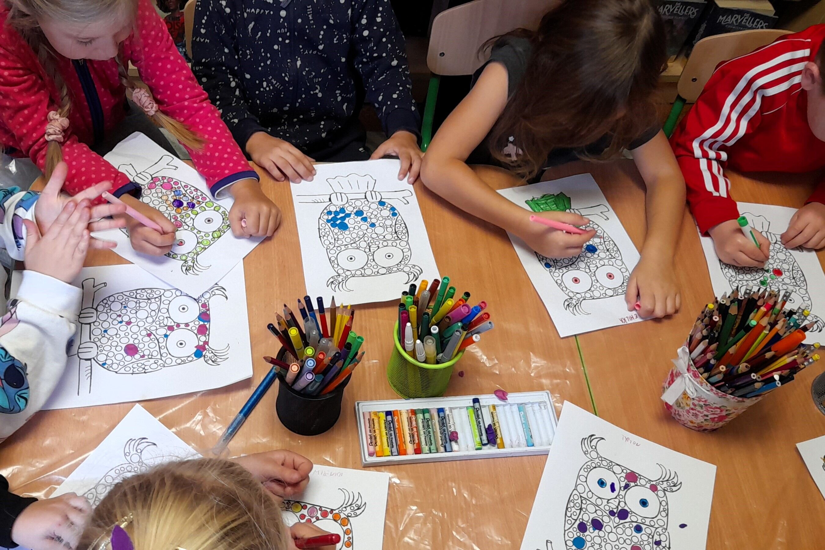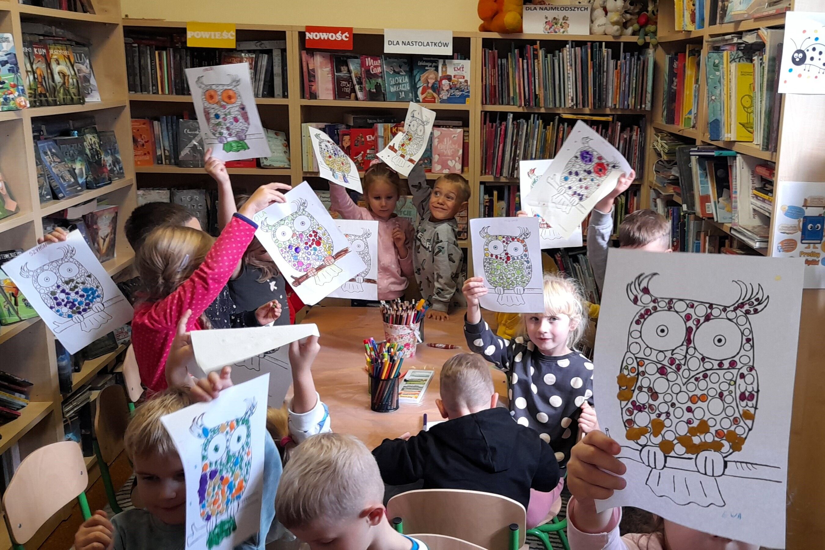 Na zakończenie zajęć przedszkolaki wykonały prace plastyczne tworząc przepiękne nakrapiane sowy, które są symbolem mądrości, książki i biblioteki. Pomysłów na wykonanie pracy nie brakowało. Każde z dzieci ozdobiło swoją sowę po swojemu tworząc wyjątkowe i niepowtarzalne obrazy. Zapraszamy ponownie – tym razem na zajęcia w tematyce jesiennej oraz oczywiście na spotkanie w ramach 11 Ogólnopolskiej Nocy Bibliotek, w tym roku odbywającej się pod hasłem „Do działa!”
