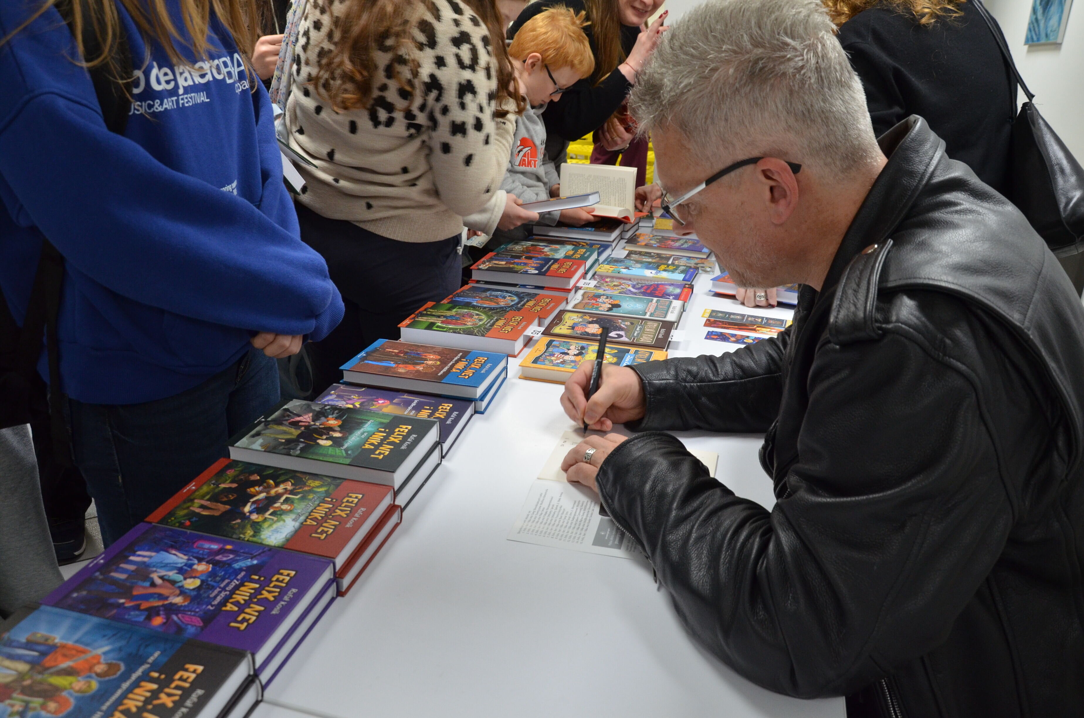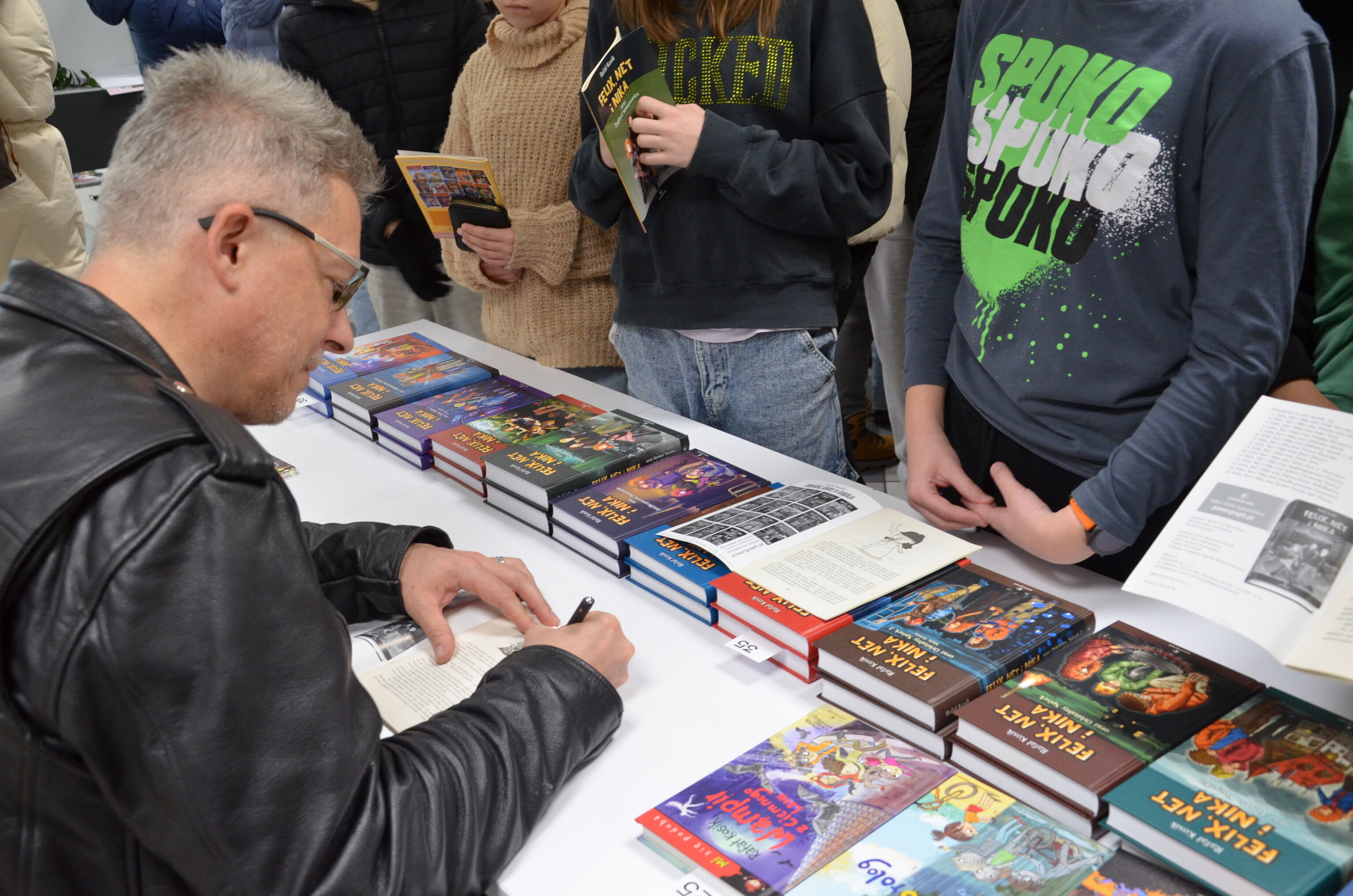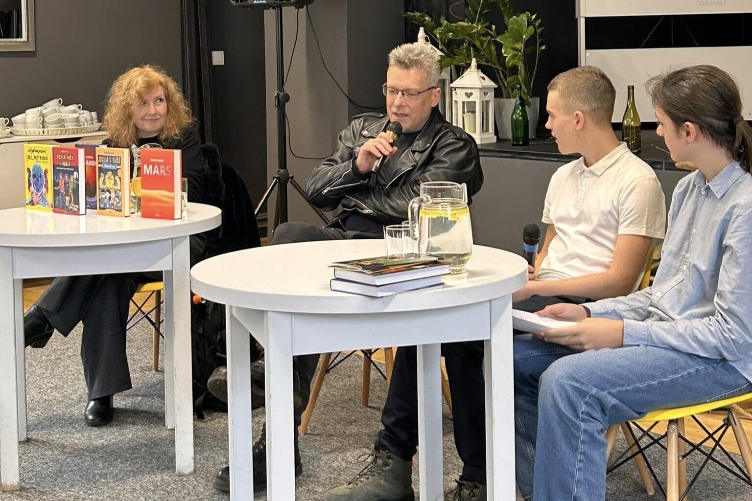 Pisarz od pierwszych chwili przyciągnął uwagę młodzieży. Może to ten błysk w oku, może spokojny, ciepły ton głosu, a może fakt, że mówił o swojej pracy tak, jakby to była najlepsza przygoda świata. Autor opowiadał o swoich początkach – od dziecięcych historyjek i komiksów inspirowanych kolegami z klasy, po pierwsze opowiadania publikowane w „Nowej Fantastyce”. Mówił o tym, skąd biorą się jego pomysły: z podróży, rozmów, obserwacji świata, z pasji do technologii, ale też z codzienności i chwil spędzanych w ulubionej kawiarni z notatnikiem, który mieliśmy okazję zobaczyć. Zwyczajne-niezwyczajne kartki zapisane drobnym pismem wieczorami przeobrażają się w historie, które czytają dziś tysiące młodych ludzi. Dowiedzieliśmy się również, że pierwsza książka dla dzieci powstała z… potrzeby napisania czegoś ciekawego dla syna. Okazało się, że chłopiec był zachwycony tymi historiami, a tata odkrył w sobie kolejną pisarską ścieżkę. Zbiorek tych rodzinnych opowieści stał się zalążkiem Felixa, Neta i Niki, a dziś autor pracuje już nad 19. tomem. Co więcej – Teoretycznie Możliwa Katastrofa doczekała się filmowej adaptacji, której scenariusz zdobył nagrodę w Polsko-Włoskim Konkursie na Film dla Młodego Widza.