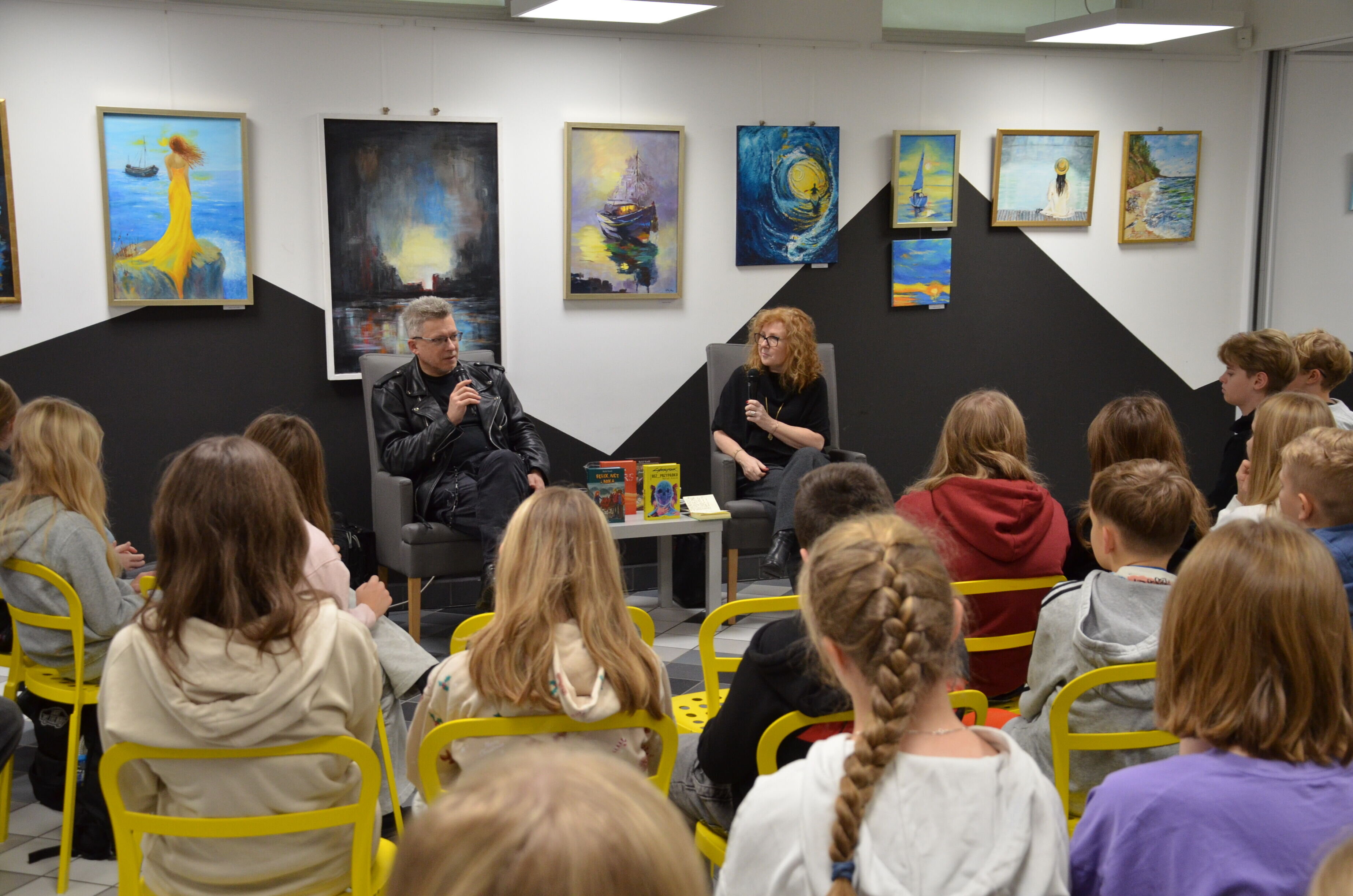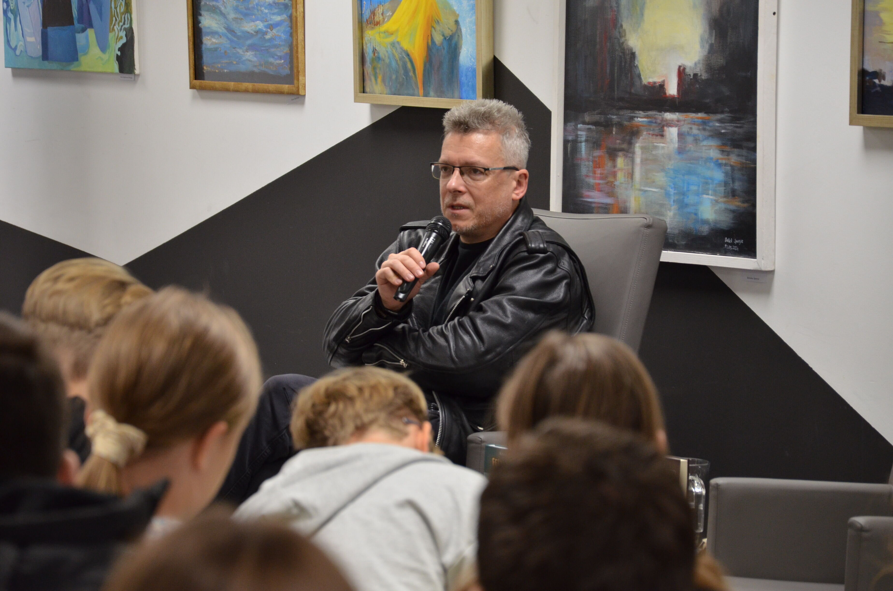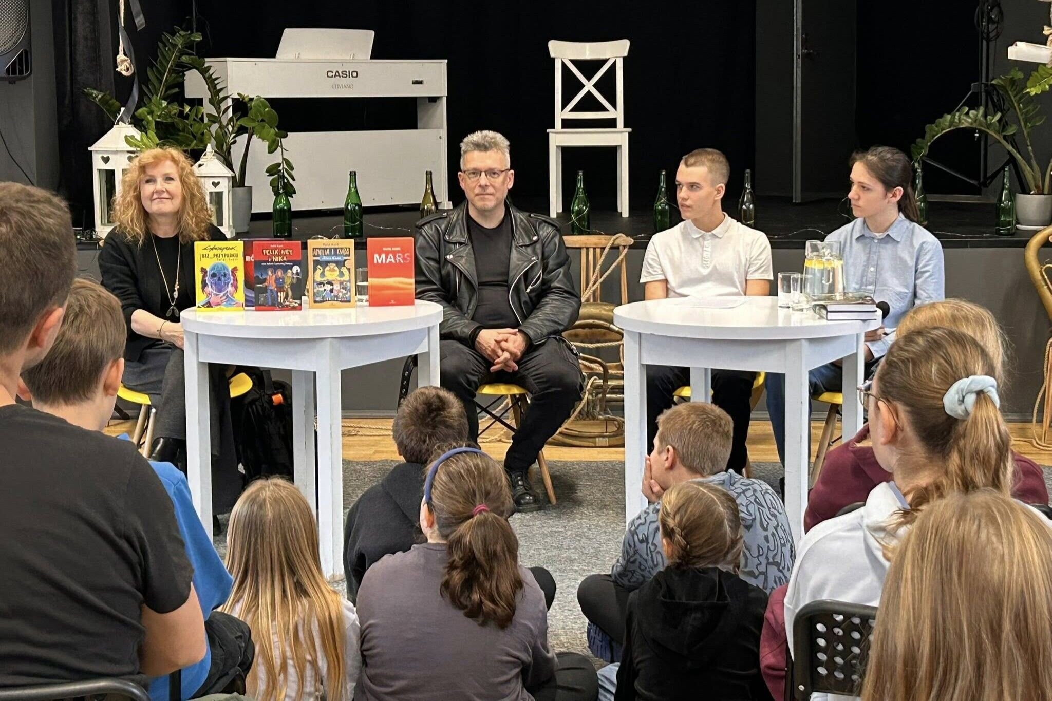 Rozmowa z Rafałem Kosikiem płynęła zupełnie naturalnie – raz w stronę fantastyki naukowej i jej wymagającej natury, innym razem w kierunku inspiracji, z których rodzą się jego historie, a jeszcze innym ku zupełnie codziennym tematom. Uczniowie chętnie zadawali pytania pytania: o proces pisania, o ulubione postacie, o pomysły, ale także o to, jak wygląda jego zwyczajny dzień i co sprawia mu przyjemność poza tworzeniem. Z ich dociekań wyłonił się obraz człowieka otwartego, pełnego pasji i ciekawości świata, który uwielbia sport, podróże, samochody, kuchenne eksperymenty i nowinki techniczne. Każde z tych zainteresowań da się przecież wyczuć w jego opowieściach, bo – jak sam przyznał – bohaterowie jego książek często noszą w sobie odrobinę jego samego. Nic dziwnego, że pisarz znalazł z młodymi uczestnikami wspólny język – porusza się przecież zupełnie naturalnie w świecie ich zainteresowań, również tych związanych z grami komputerowymi. Wszystko to sprawiło, że rozmowy były żywe, pełne humoru i naprawdę inspirujące.