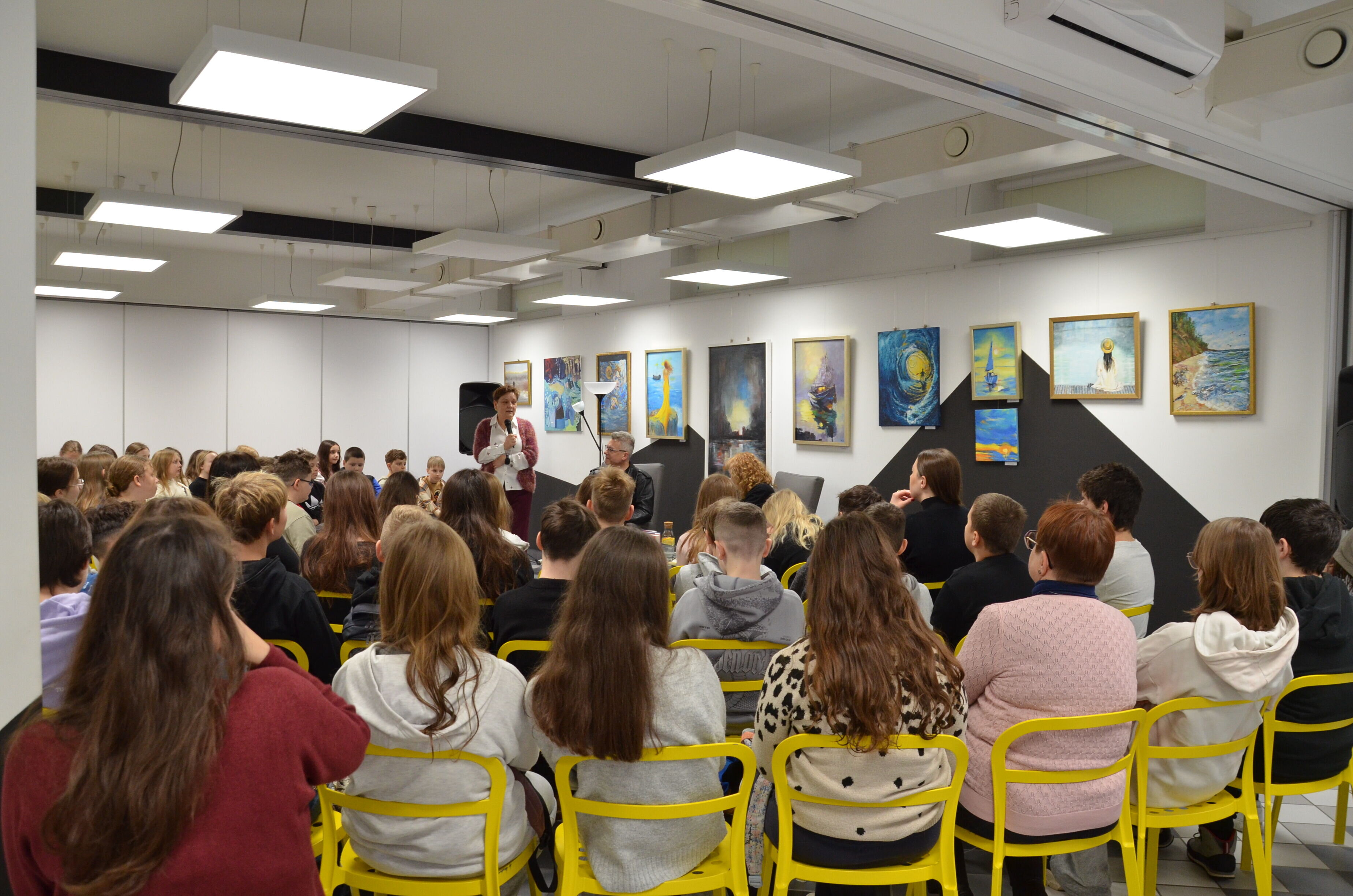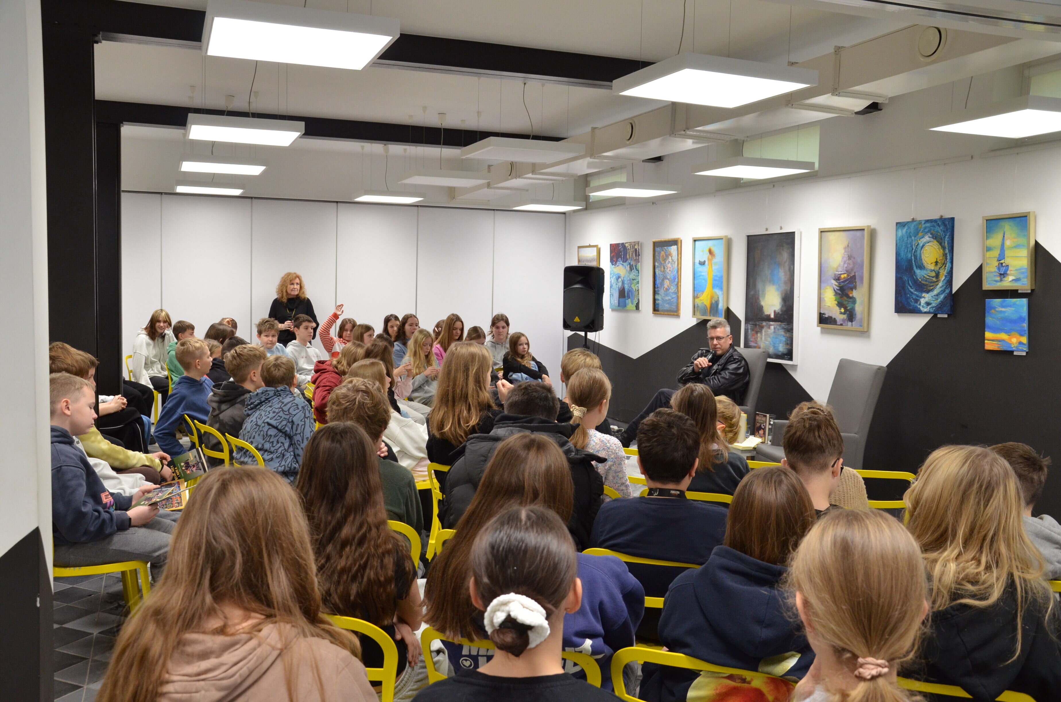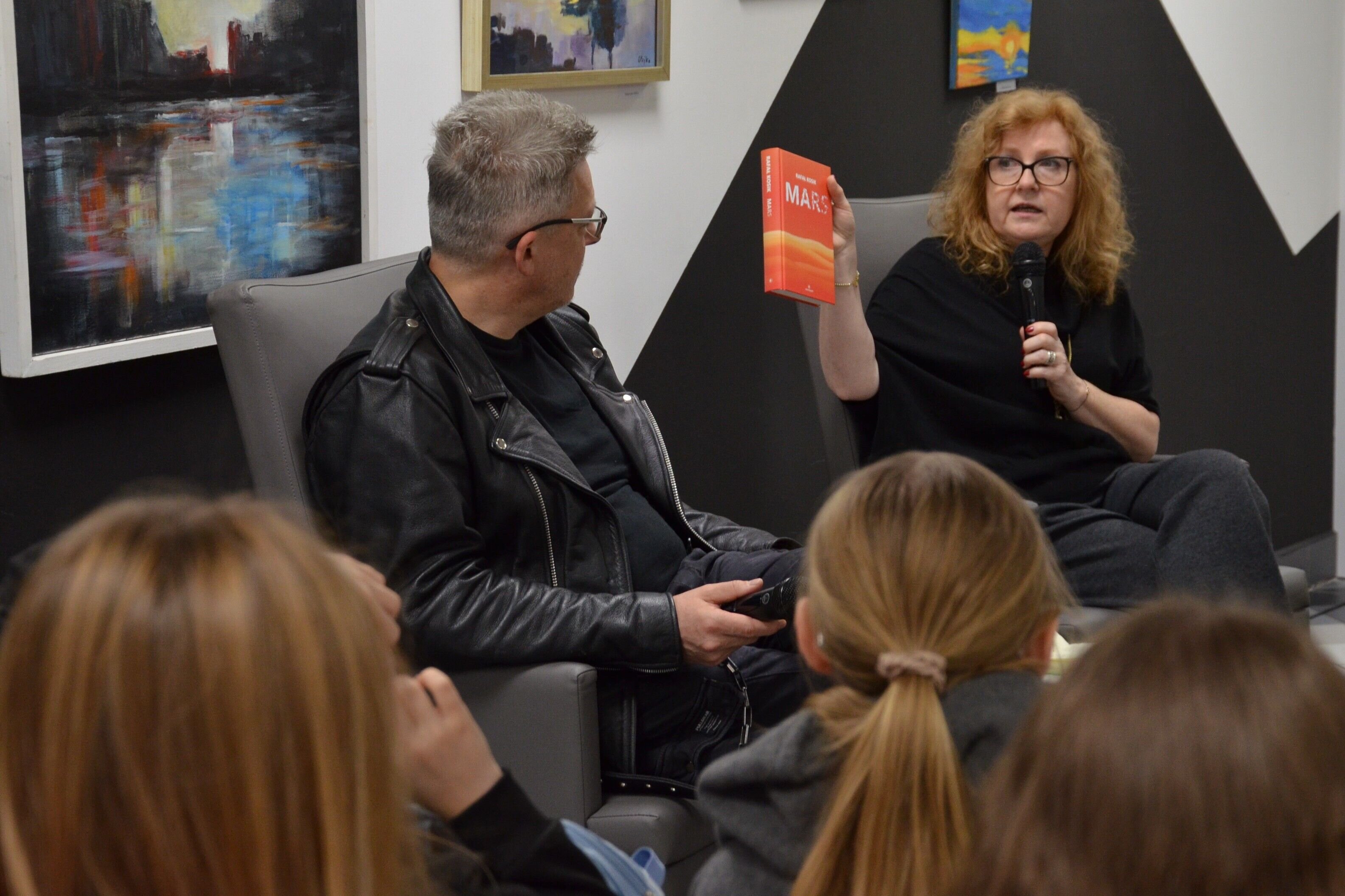 Rozmowa z Rafałem Kosikiem płynęła zupełnie naturalnie – raz w stronę fantastyki naukowej i jej wymagającej natury, innym razem w kierunku inspiracji, z których rodzą się jego historie, a jeszcze innym ku zupełnie codziennym tematom. Uczniowie chętnie zadawali pytania pytania: o proces pisania, o ulubione postacie, o pomysły, ale także o to, jak wygląda jego zwyczajny dzień i co sprawia mu przyjemność poza tworzeniem. Z ich dociekań wyłonił się obraz człowieka otwartego, pełnego pasji i ciekawości świata, który uwielbia sport, podróże, samochody, kuchenne eksperymenty i nowinki techniczne. Każde z tych zainteresowań da się przecież wyczuć w jego opowieściach, bo – jak sam przyznał – bohaterowie jego książek często noszą w sobie odrobinę jego samego. Nic dziwnego, że pisarz znalazł z młodymi uczestnikami wspólny język – porusza się przecież zupełnie naturalnie w świecie ich zainteresowań, również tych związanych z grami komputerowymi. Wszystko to sprawiło, że rozmowy były żywe, pełne humoru i naprawdę inspirujące.