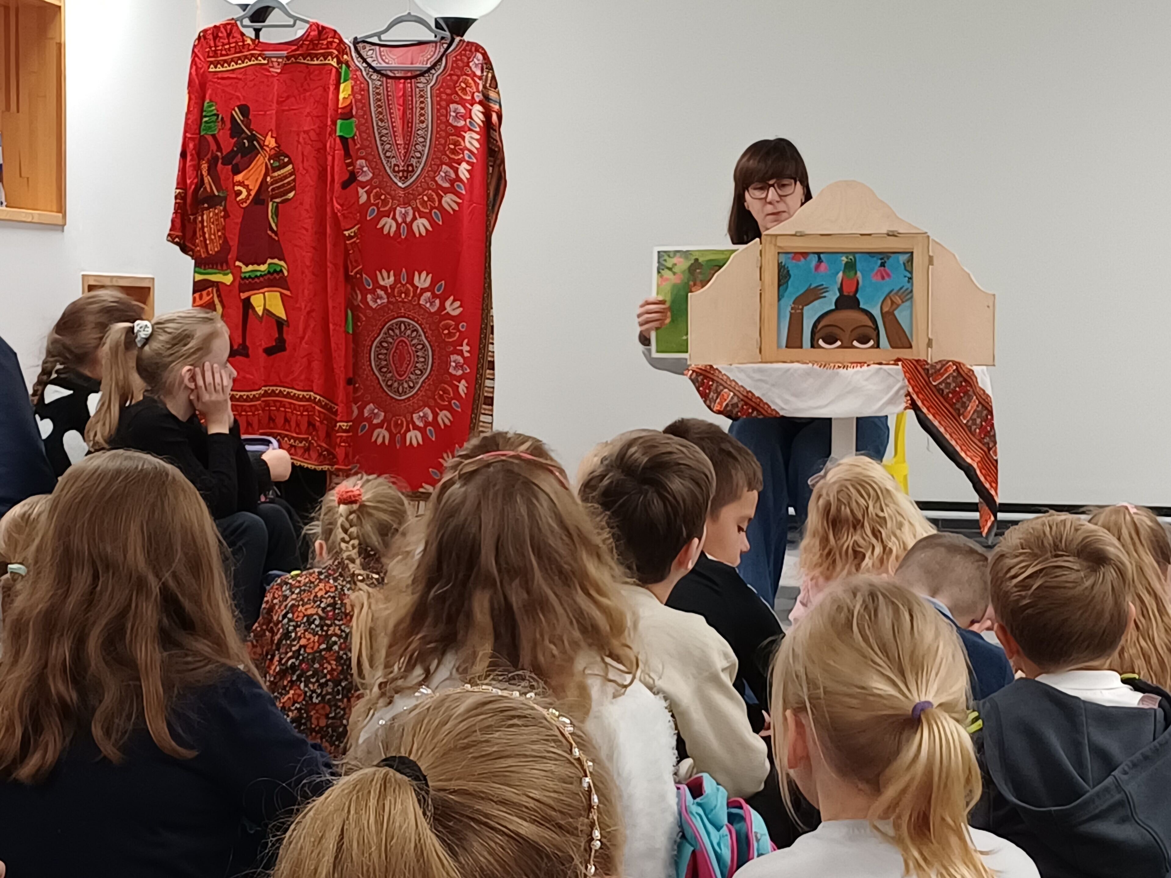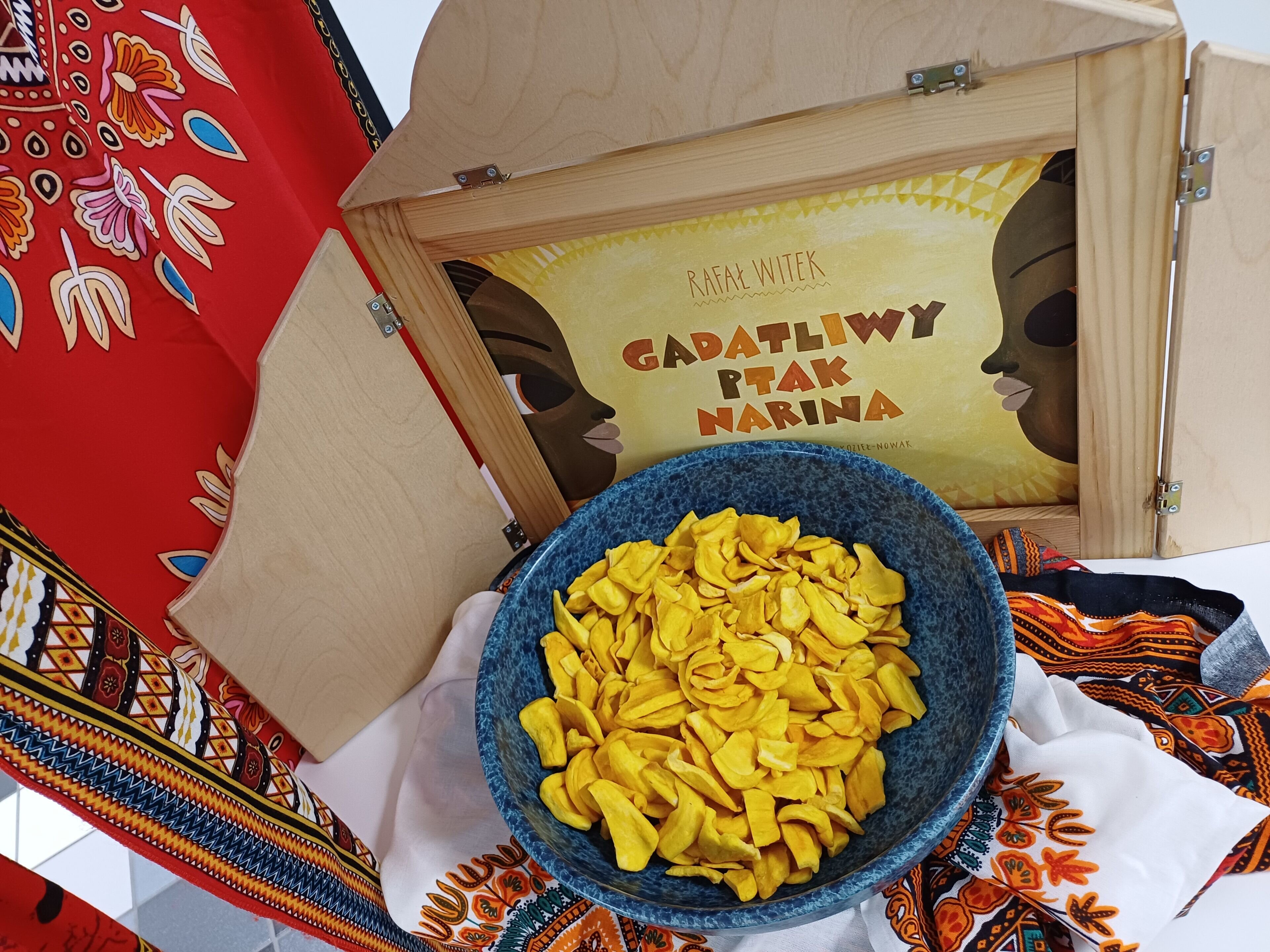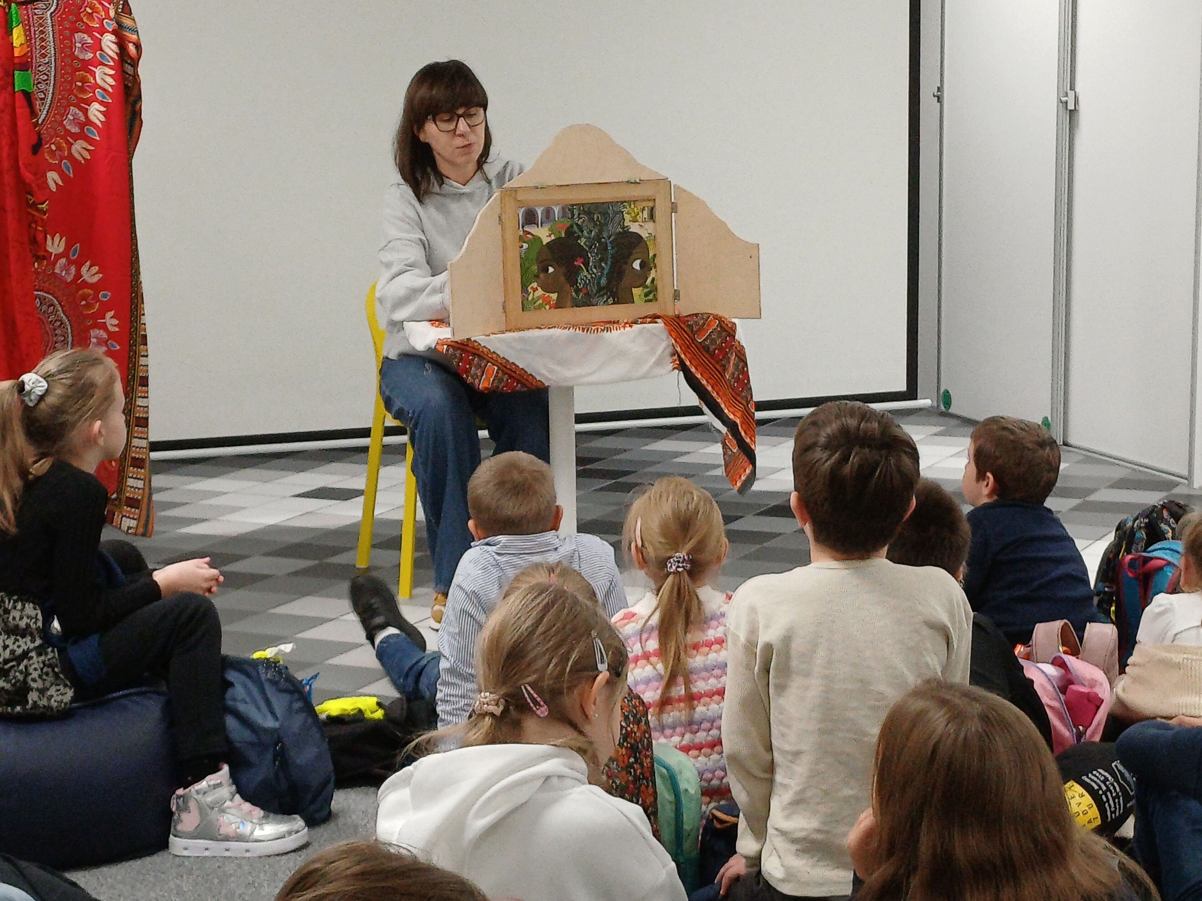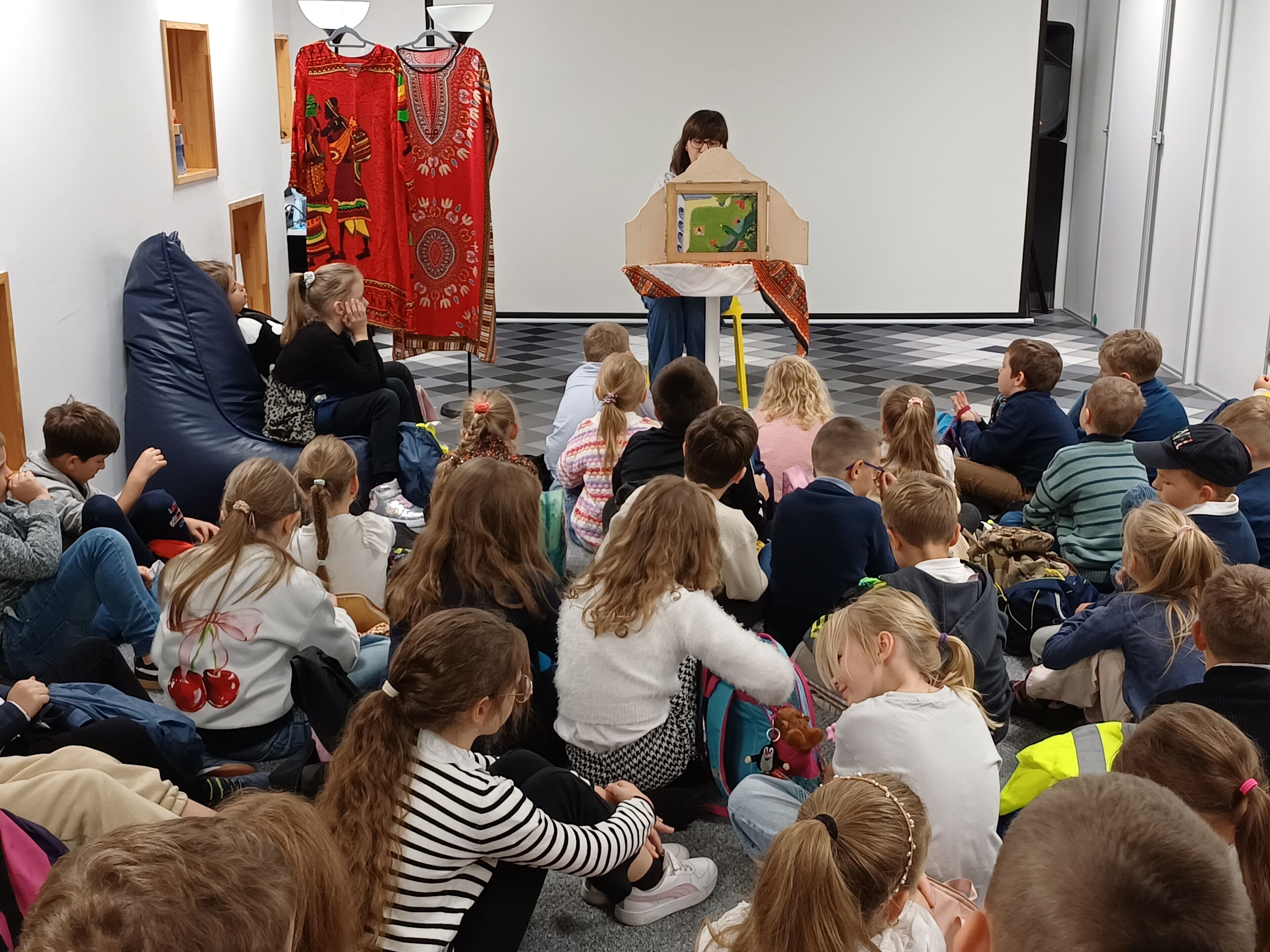 Dzieci wysłuchały ciekawej i barwnej opowieści o Narinie — ptaku z Ugandy, którego gadatliwość, choć z pozoru mogłaby uchodzić za wadę, okazała się w tym przypadku niezwykle przydatna i doprowadziła do szczęśliwego zakończenia. Historia została zaprezentowana w formie japońskiego teatrzyku kamishibai. Dzieci dowiedziały się, skąd pochodzi ten sposób snucia opowieści i na czym polega jego wyjątkowość. Następnie zwiedziły bibliotekę, zjadły drugie śniadanie i — ku naszej ogromnej radości — oświadczyły, że wrócą z rodzicami wypożyczyć książki.