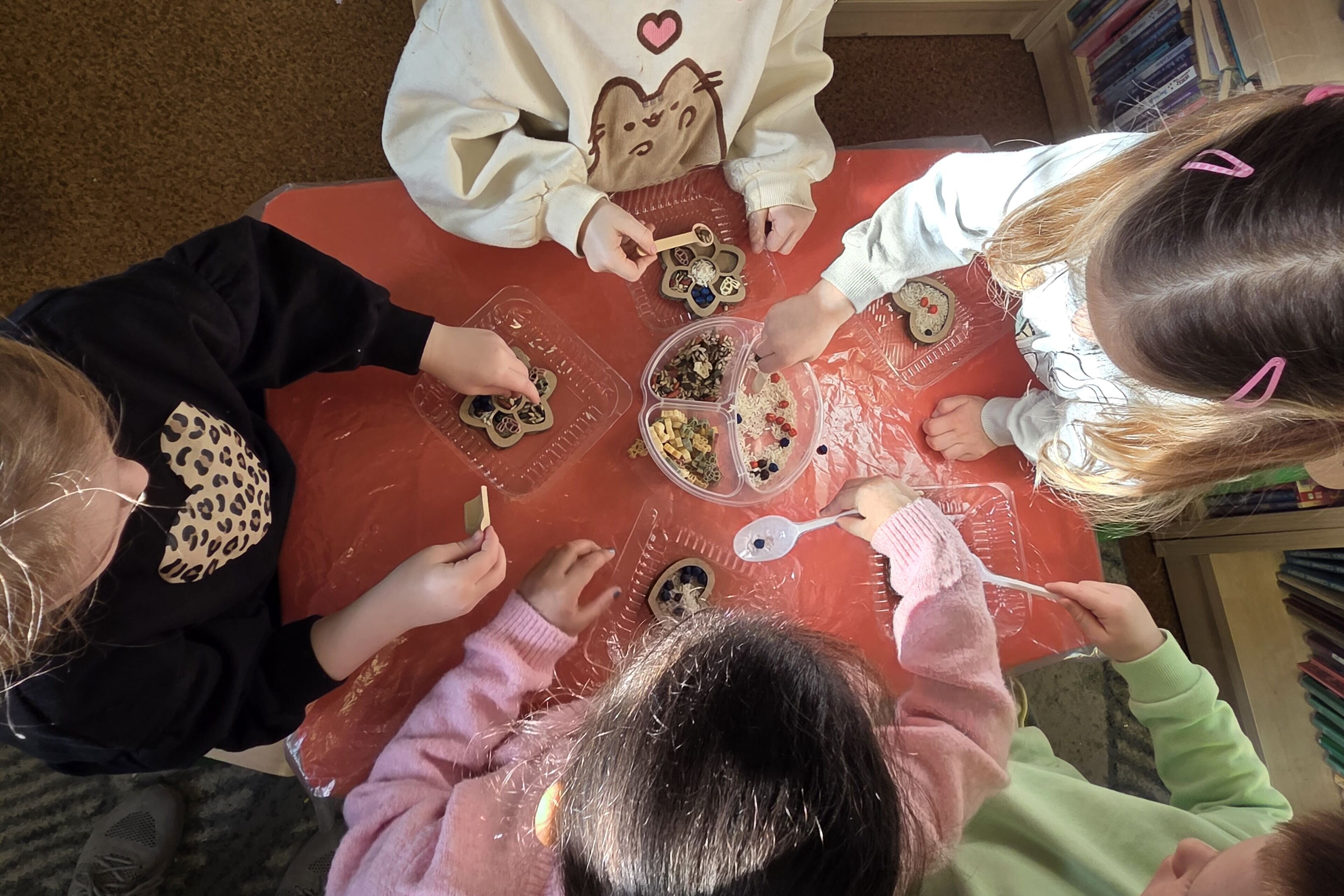 W dniu 13 lutego 2026 r. przedszkolaki z dyżuru feryjnego z Przedszkola Samorządowego w Zabierzowie Bocheńskim odwiedziły bibliotekę. Na początku zajęć przedszkolaki poznały książki przybliżające dzieciom tematykę uczuć i emocji tj. „Kocham Cię do końca świata (i jeden dzień dłużej)” oraz „Nawet nie wiesz jak bardzo Cię kocham”. Następnie przedszkolaki bawiły się wspaniale tacami z sensokartonami tworząc swoje „mini światy”. Dzieci wypełniały, przesypywały, ozdabiały szablony w literkowych i kwiatowych kształtach ziarnami, makaronowymi zwierzątkami i serduszkami oraz kolorowym ryżem. Pozwoliło to na stworzenie wspólnie kreatywnej pracy plastycznej w tematyce walentynkowej.