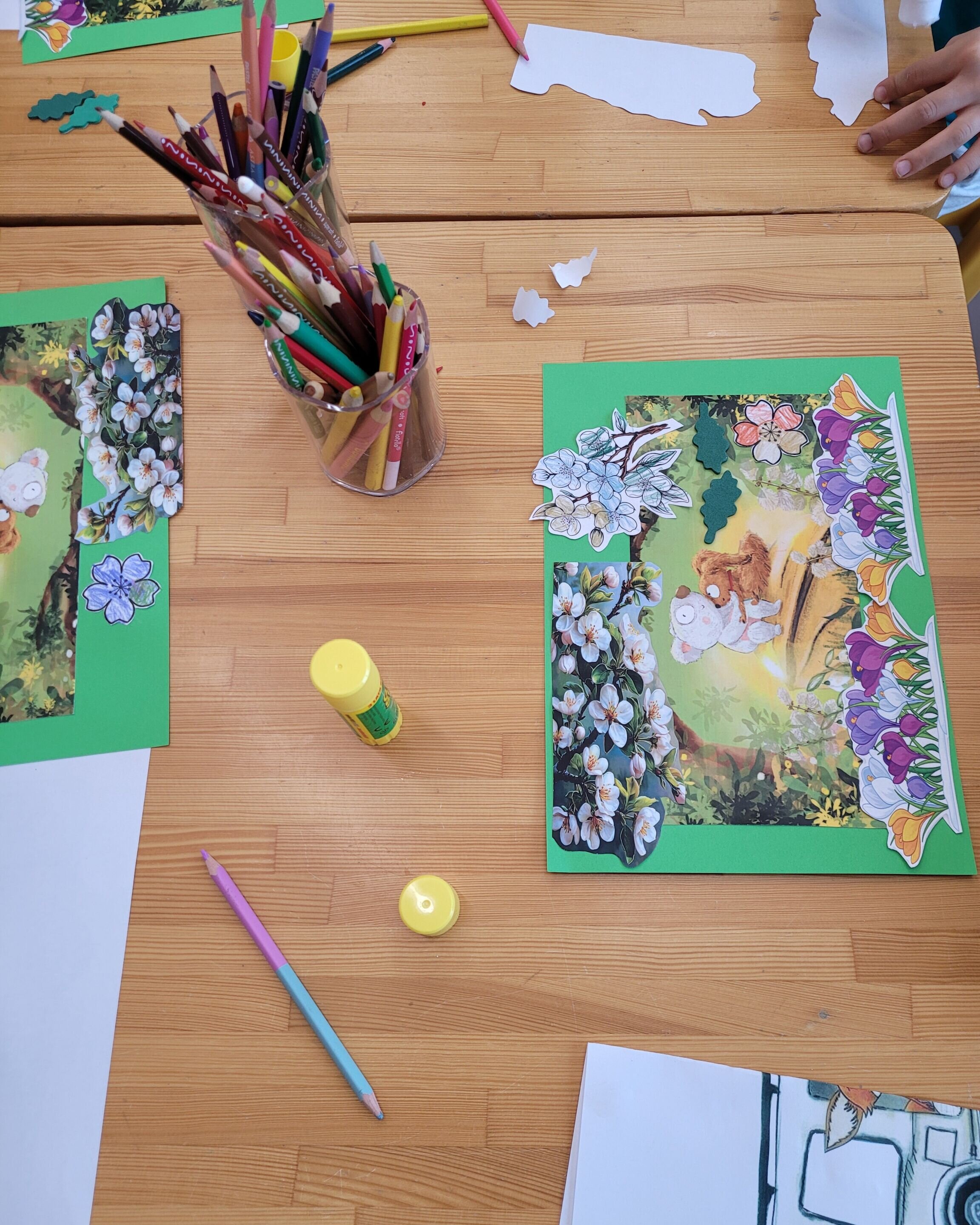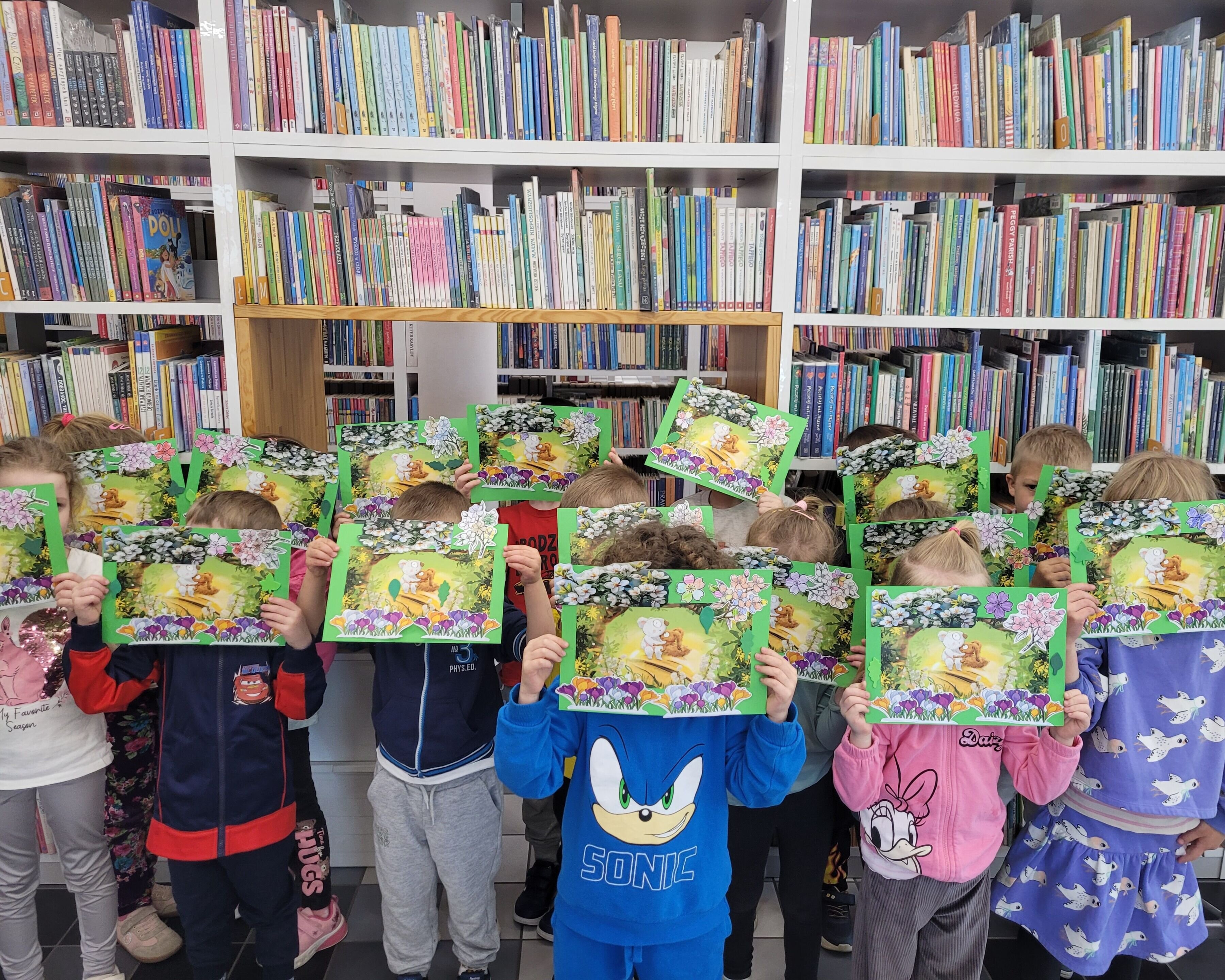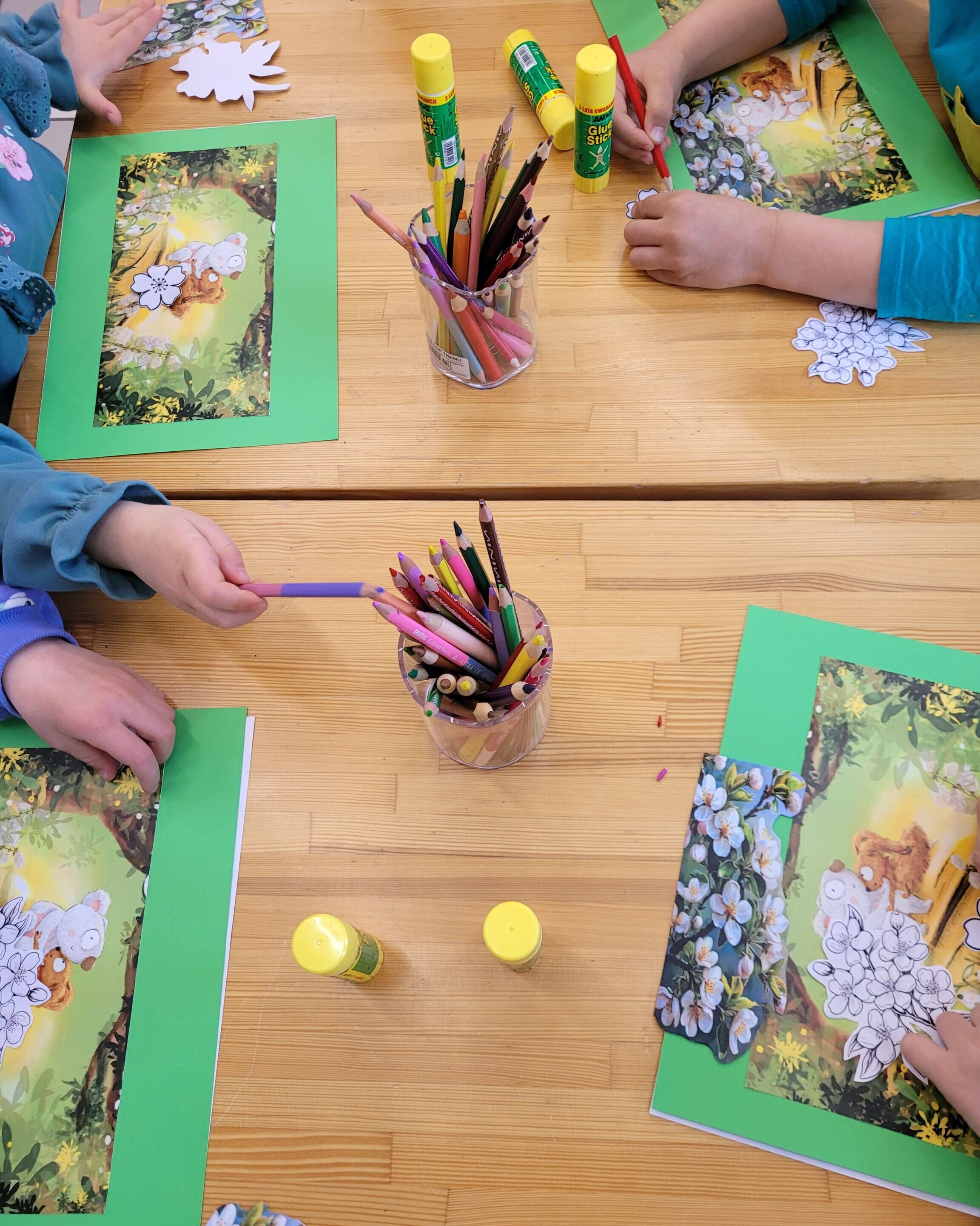 Zwieńczeniem spotkania były zajęcia plastyczne – dzieci wykonały prace przedstawiające bohaterów książki, ozdabiając je kolorowymi, wiosennymi kwiatami.
