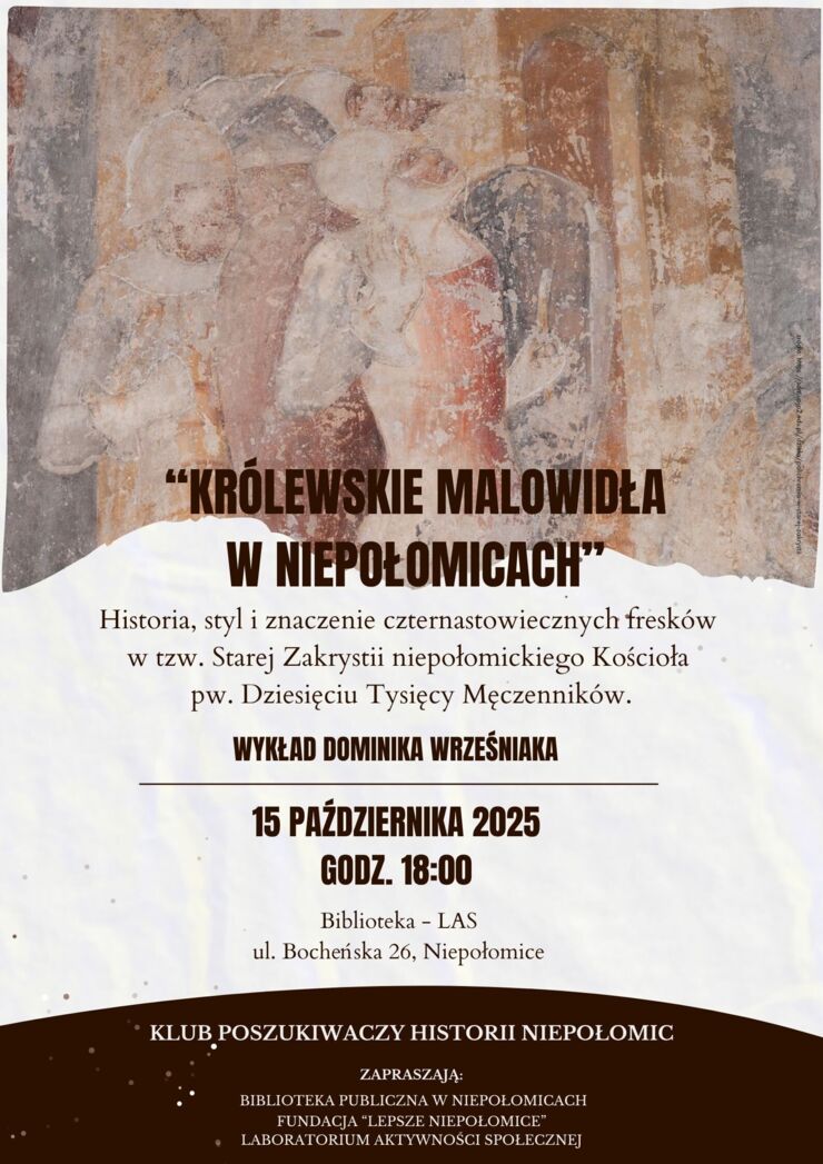 Wykład "Królewskie malowidła w Niepołomicach". Historia, styl i znaczenie czternastowiecznych fresków w tzw. Starej Zakrystii niepołomickiego Kościoła pw. Dziesięciu Tysięcy Męczenników poprowadzi: Dominik Wrześniak