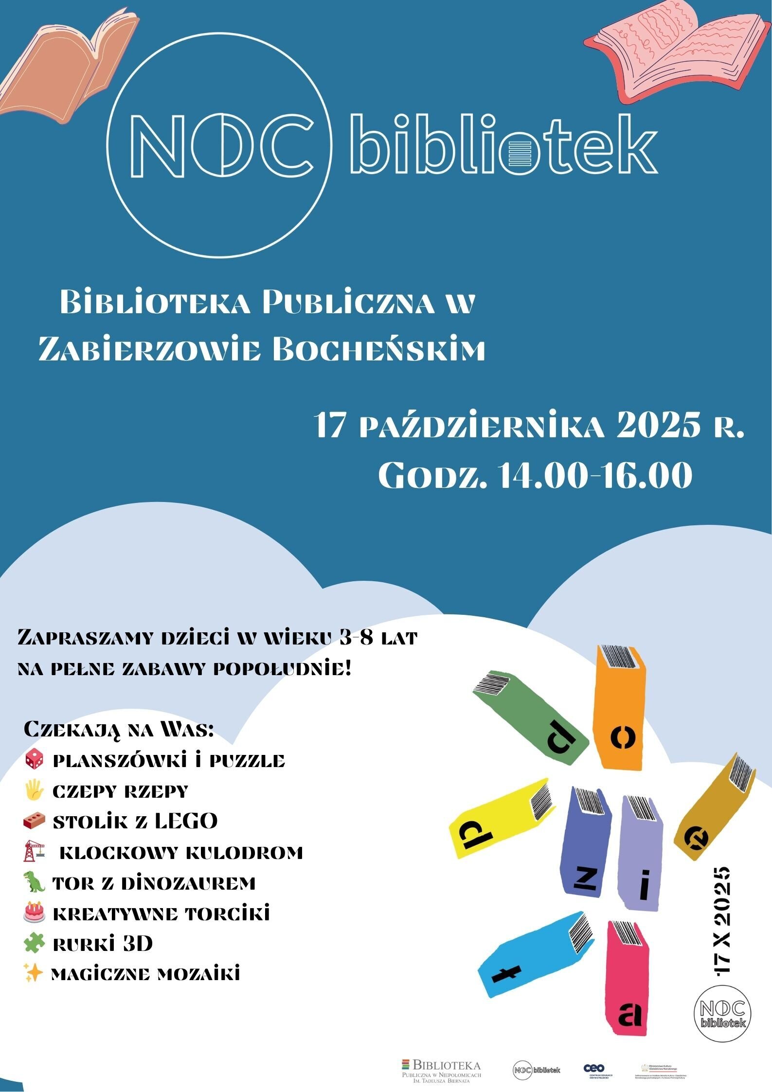 Biblioteka Publiczna w Zabierzowie Bocheńskim zaprasza do wspólnej zabawy dzieci w wieku od 3 do 8 lat.