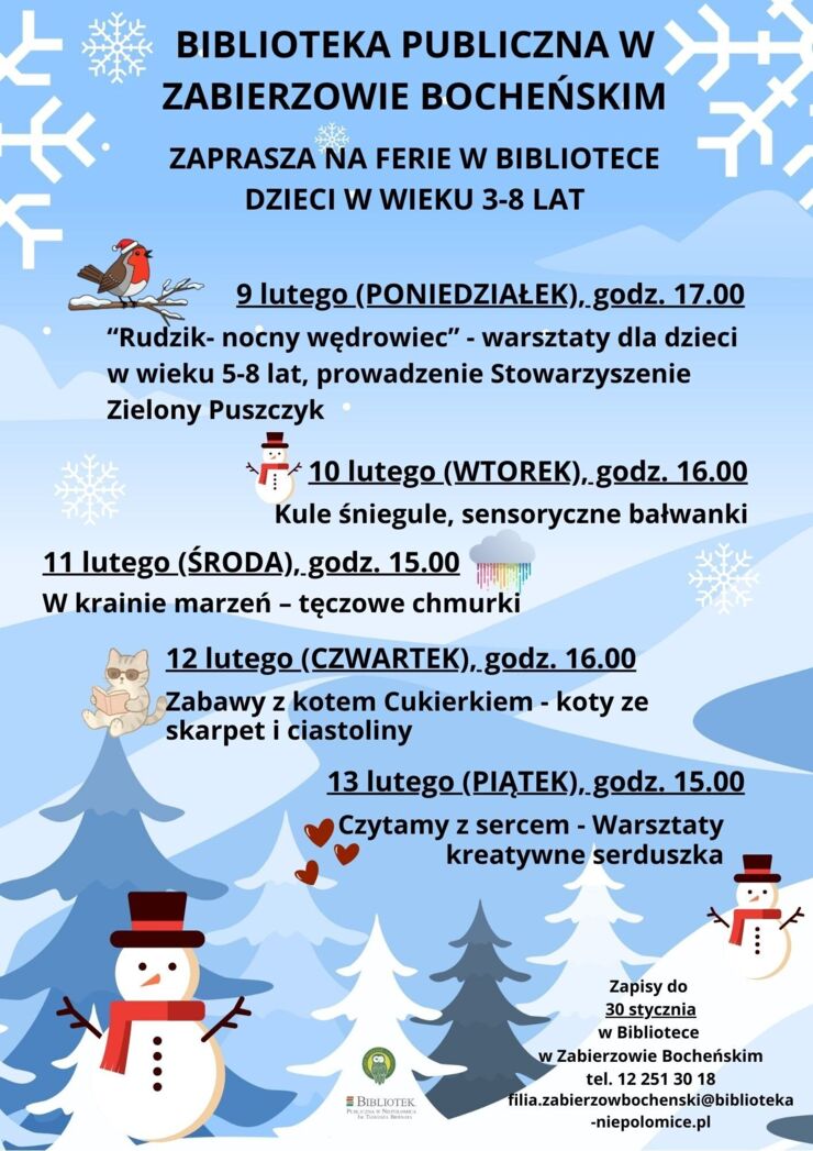 Biblioteka Publiczna w Zabierzowie Bocheńskim zaprasza dzieci w wieku 3–8 lat do udziału w akcji „FERIE Z BIBLIOTEKĄ” Będzie bajkowo, odkrywczo i zimowo!