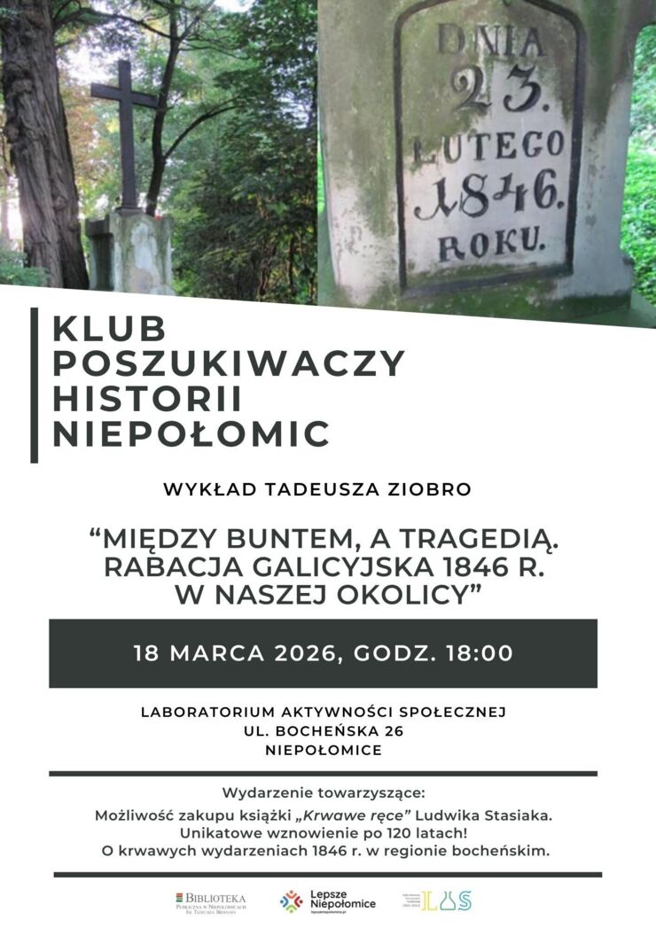 Będzie można nabyć książkę Ludwika Stasiaka pt. „Krwawe ręce”. To unikatowe wznowienie pozycji sprzed 120 lat, która w formie literackiej, ale opartej na faktach, opisuje krwawe wydarzenia w cyrkule bocheńskim w roku 1846. To pozycja obowiązkowa dla osób chcących zrozumieć traumatyczne przeżycia naszych przodków.